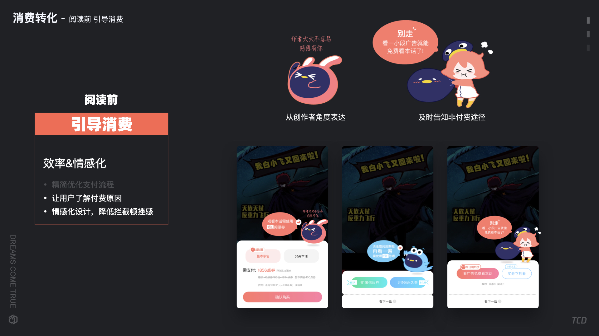 阅读中-在阅读中,核心目的是去刺激用户消费,刺激用户消费需要从内容本身去挖掘用户的消费点。这里做了两点优化:第一,优化弹幕交互形式,新增表情互动功能,用户可以直接发布表情包代替文字弹幕,降低弹幕互动门槛;第二提供个性化弹幕皮肤,皮肤有主题性质和IP维度,用户可以根据自己喜好调选各自风格或者不同作品人物的弹幕皮肤,满足用户个性化定制需求。