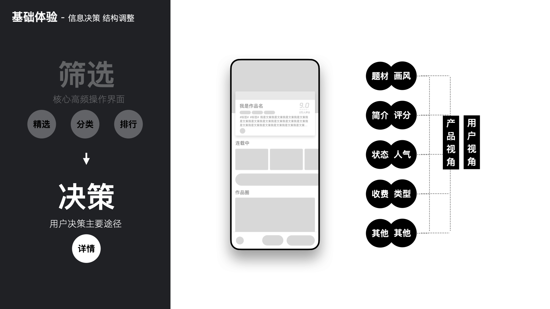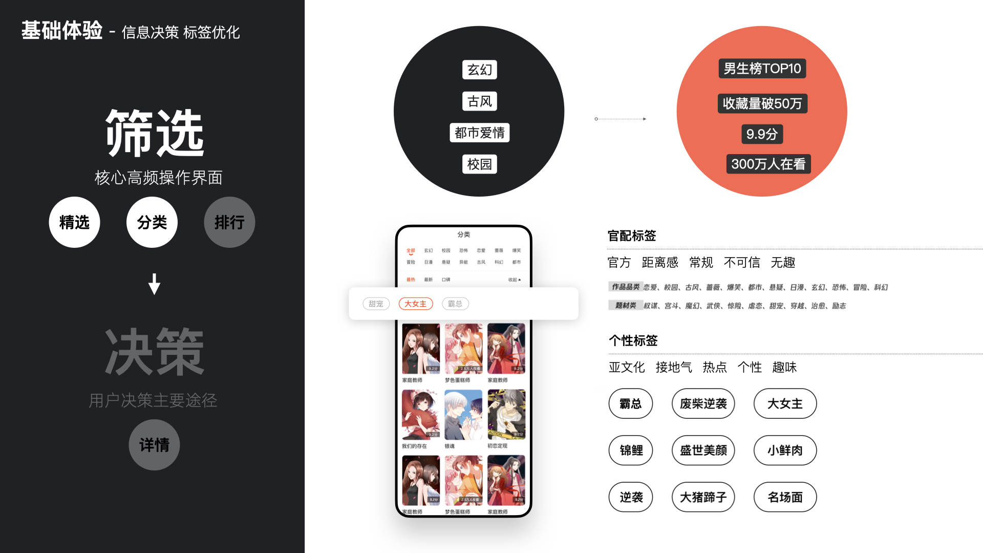 为了提升决策效率,我们在内容筛选和决策上做了比较大的调整。对排行榜的结构和信息组成都进行了大的调整,对分类标签进行了优化,作品标签由官方维度转换为了用户维度和作品维度,同时除了配置官方分类标签以外,新增符合用户认知和当下潮流的个性化分类标签。