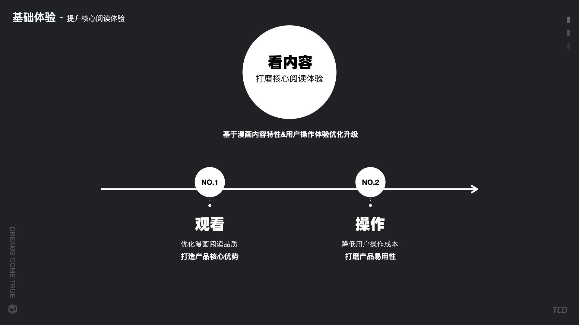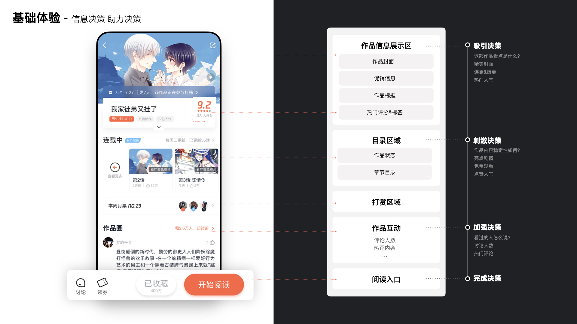 基础体验的第二部分是看内容,对于看内容的体验,我们基于漫画内容特性和用户核心的操作体验去进行了在观看体验和阅读操作上的体验优化。