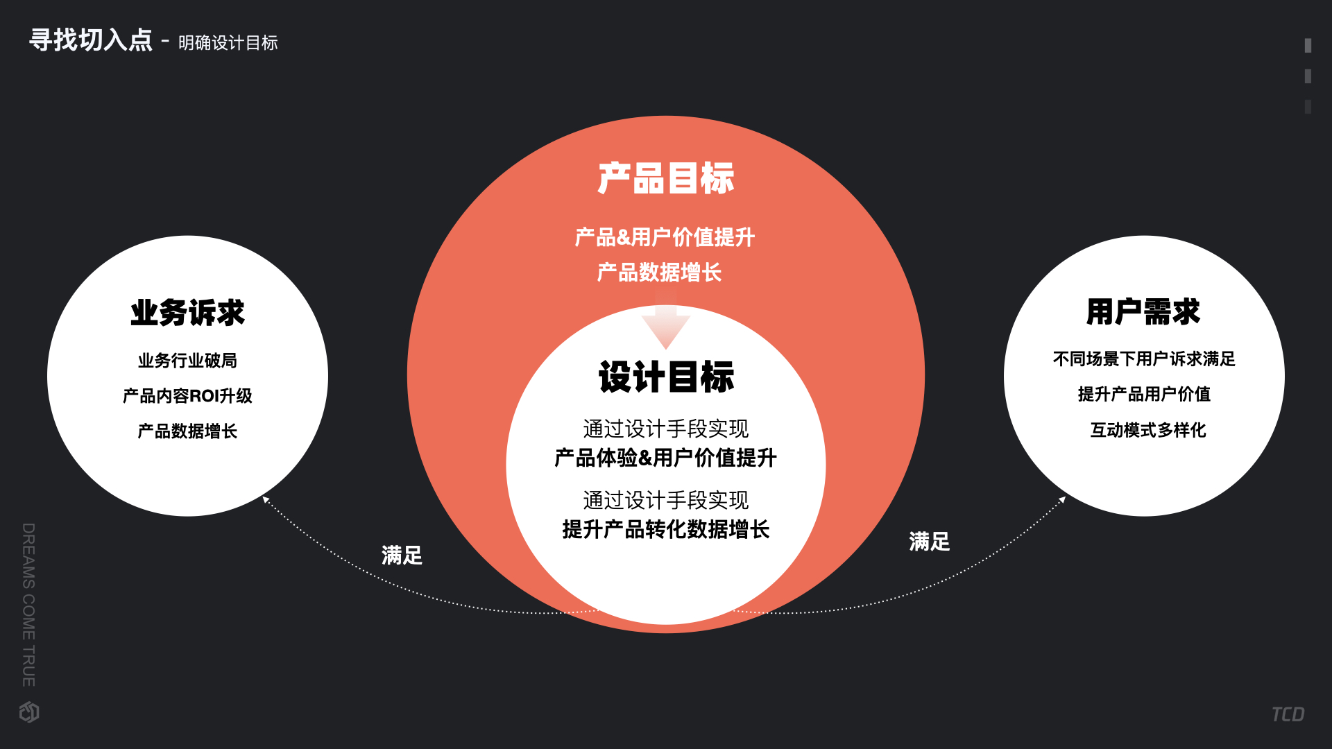 产品体验设计的价值核心体现在两个方面:1 帮助业务更好达成目标;2 给用户带来体验价值。体验设计在制定目标的时候,会围绕这两点去进行切入。通过前期对于产品问题定位发现从行业、数据、用户等不同维度分析出来的问题可以归类为两大类:业务诉求和用户需求。再根据这两大类问题结合我们产品实际情况分析出目前需要解决的问题是:1提升产品用户价值;2实现产品数据的增长;而设计目标就是通过设计手段去实现这两点。