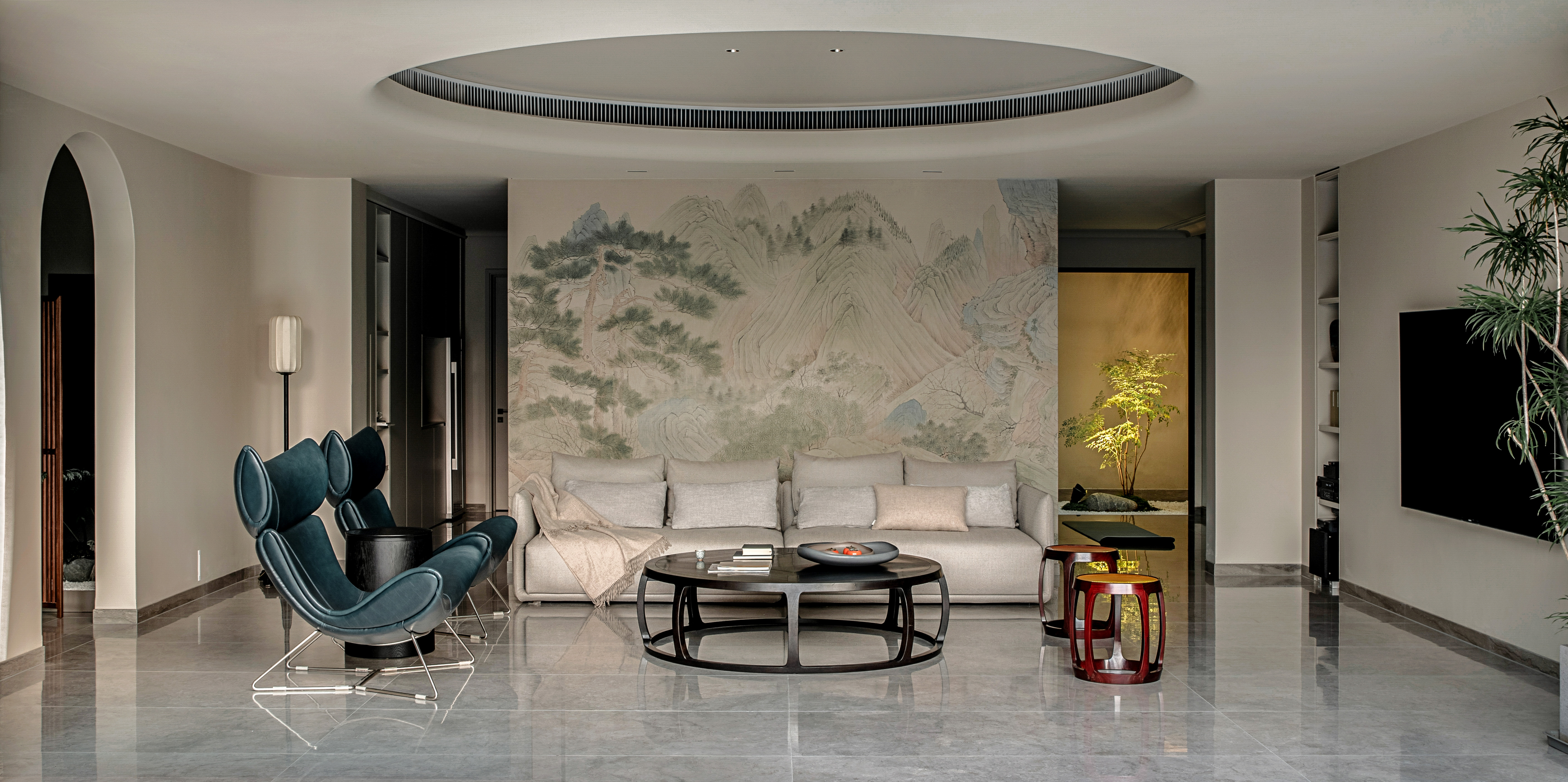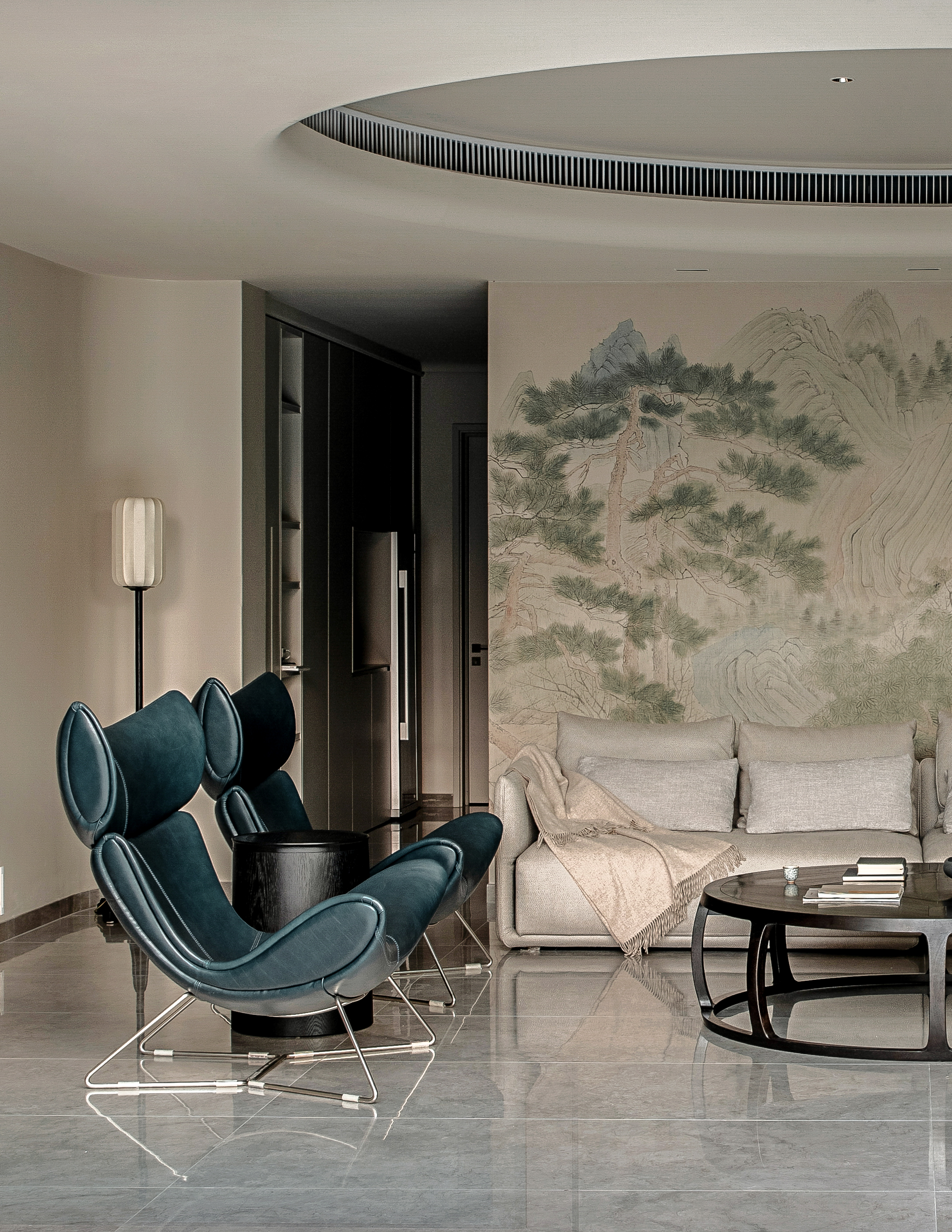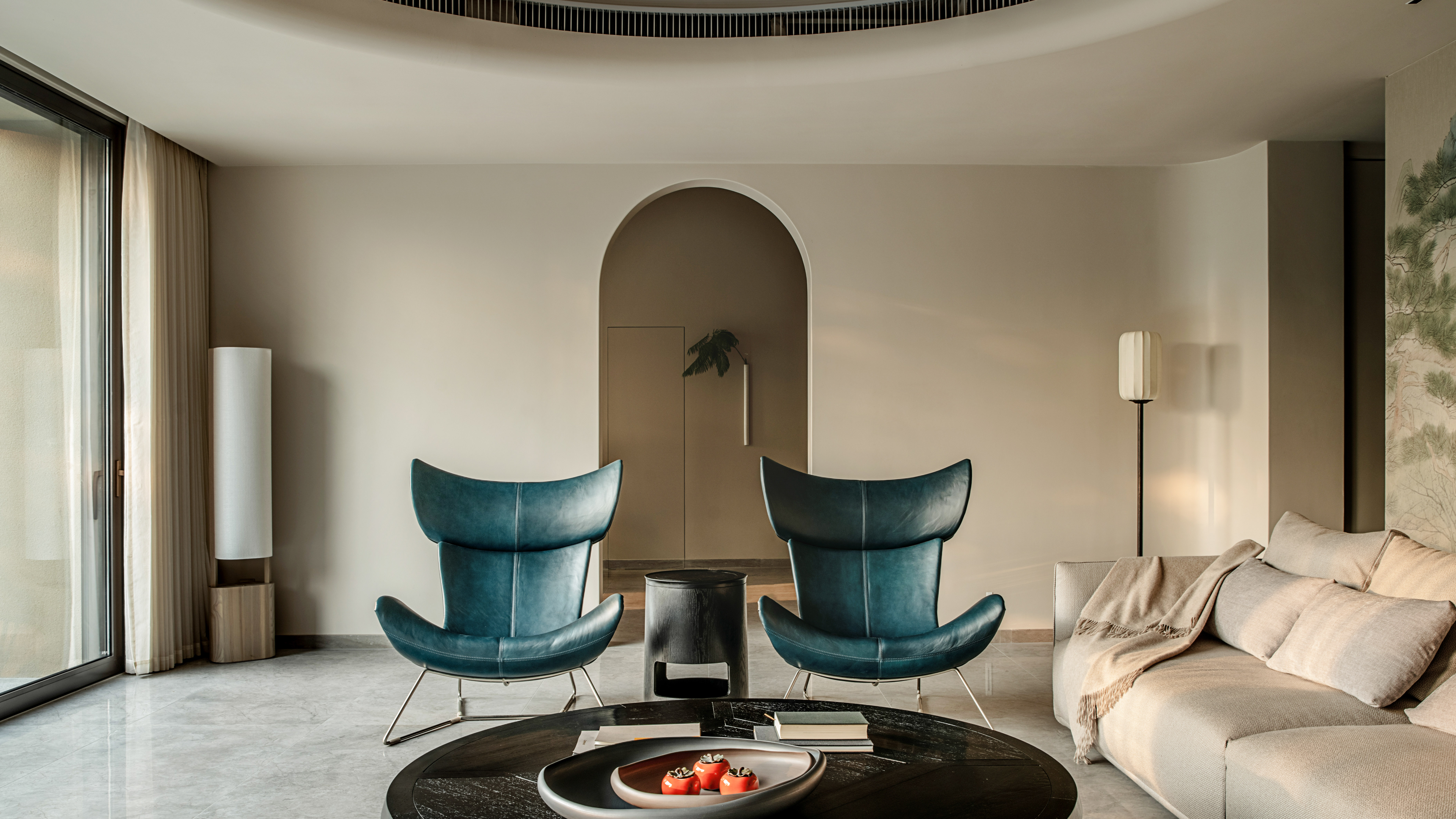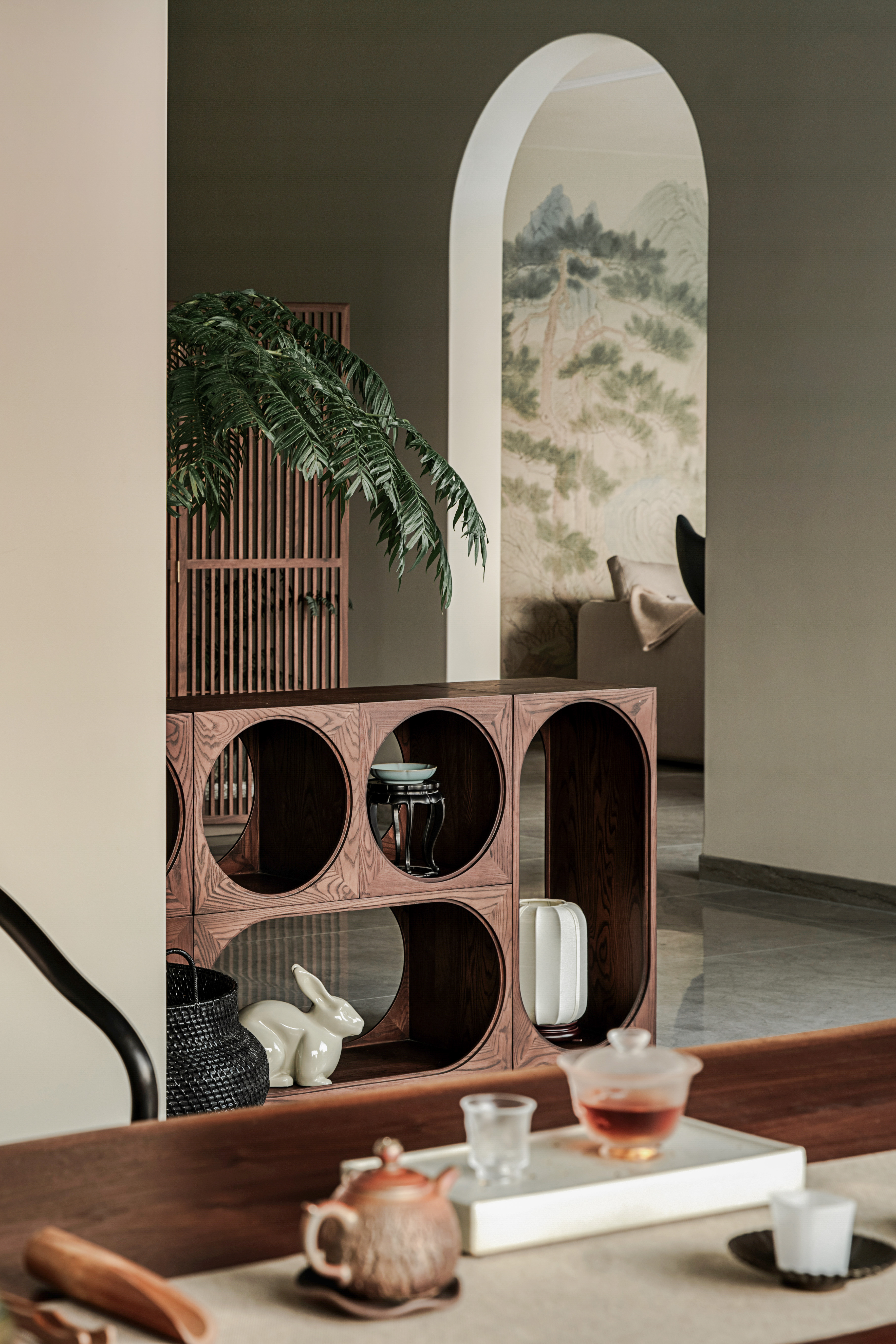 客厅、茶室中的阳角和柱子,皆采用了弧形设计,