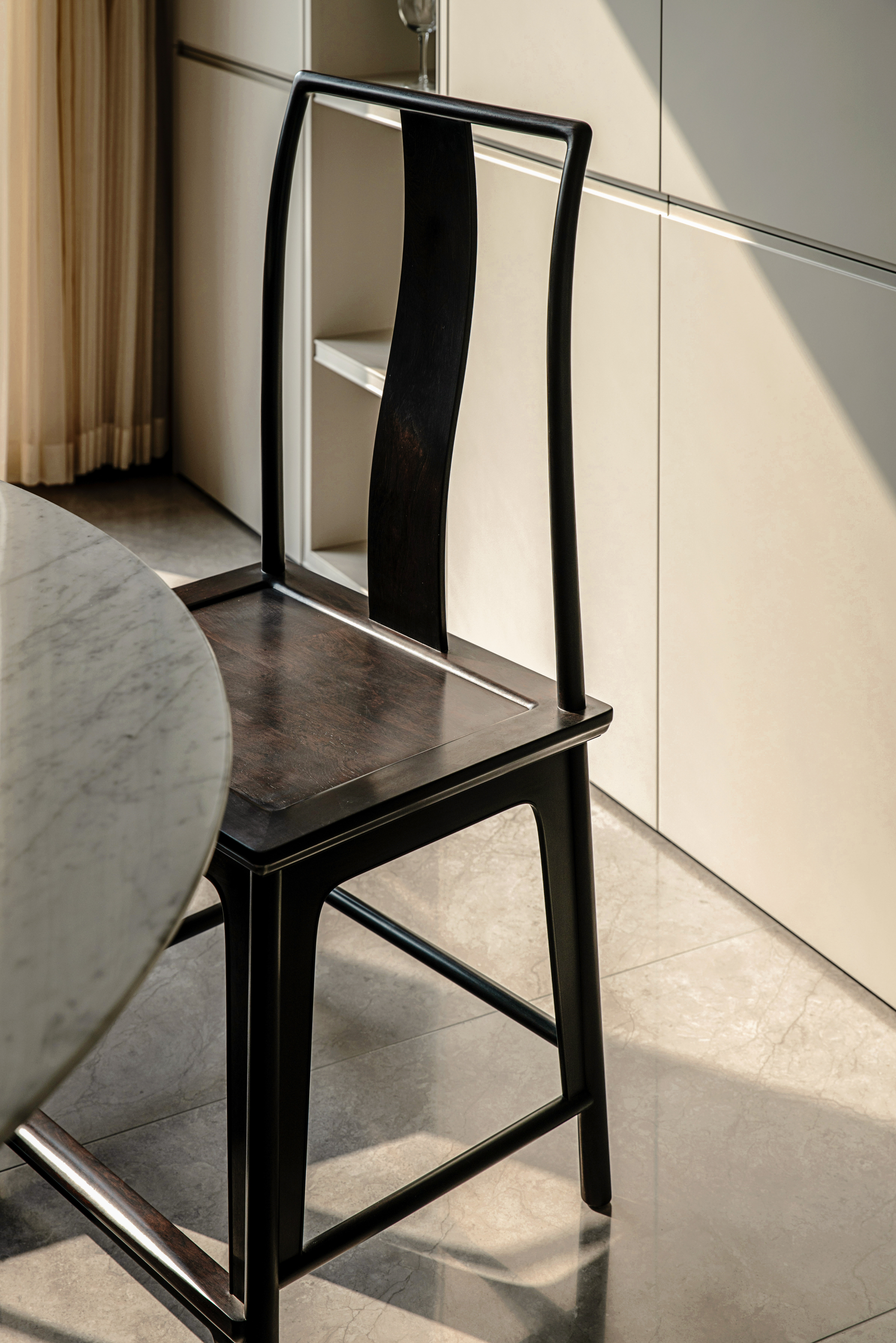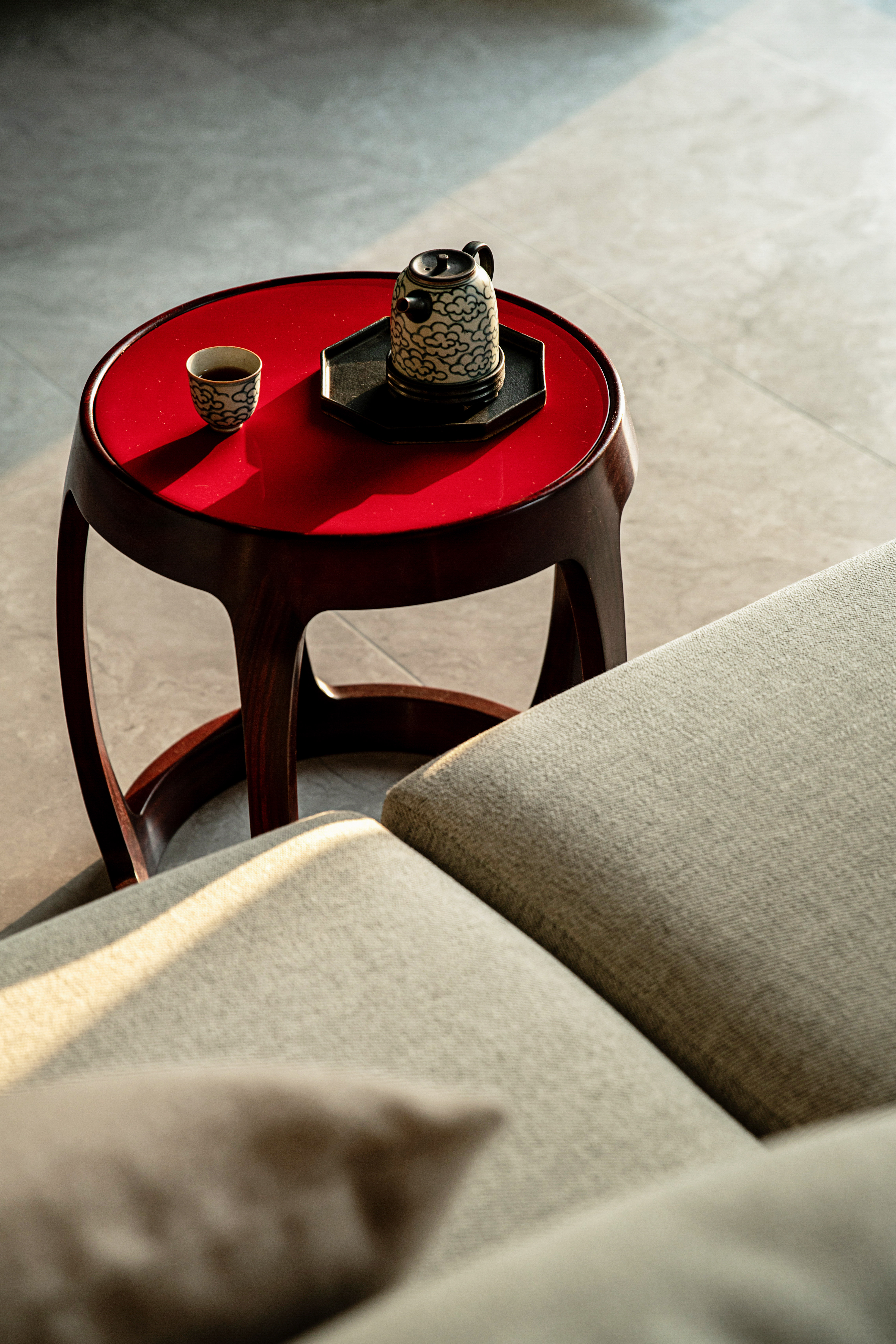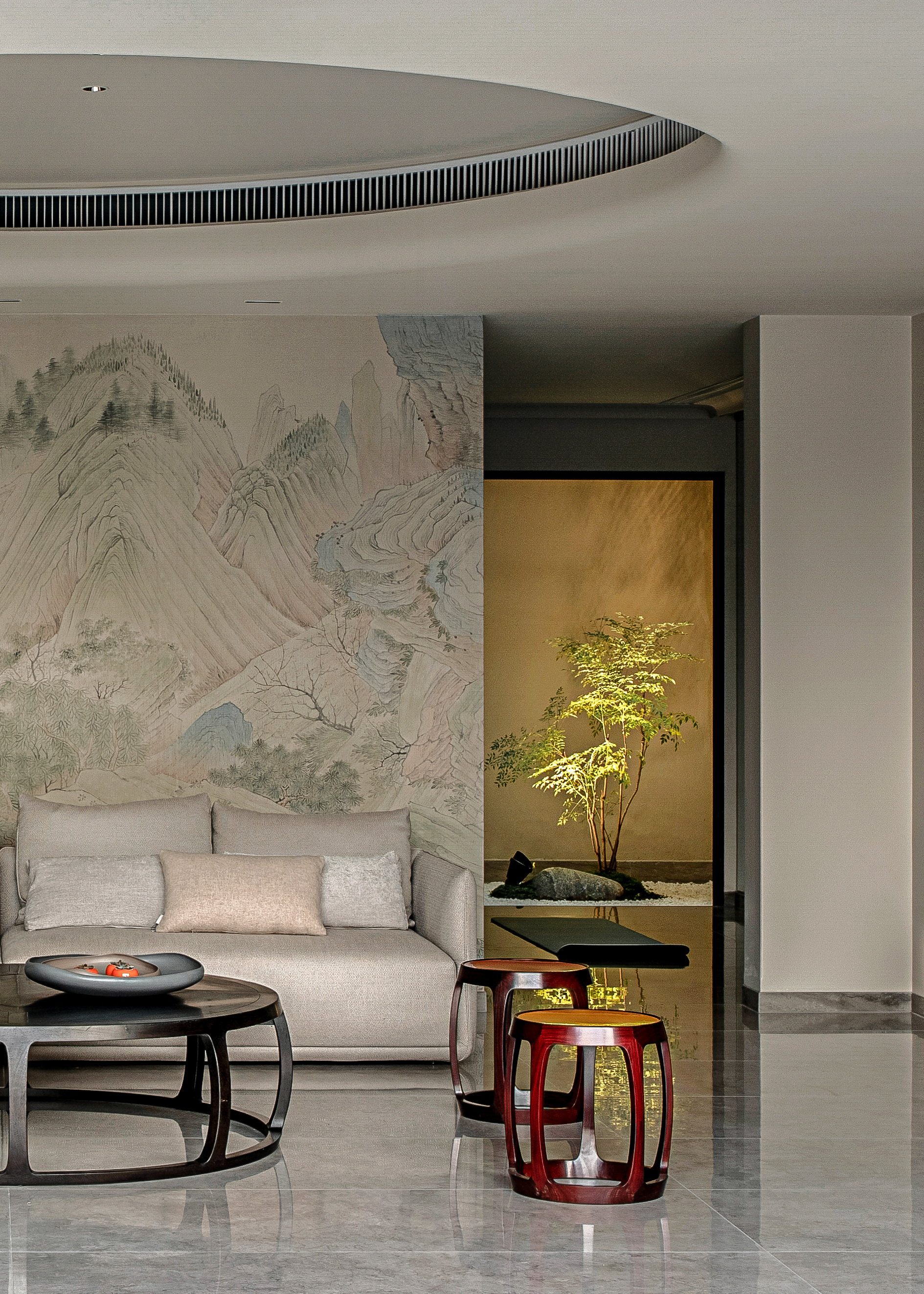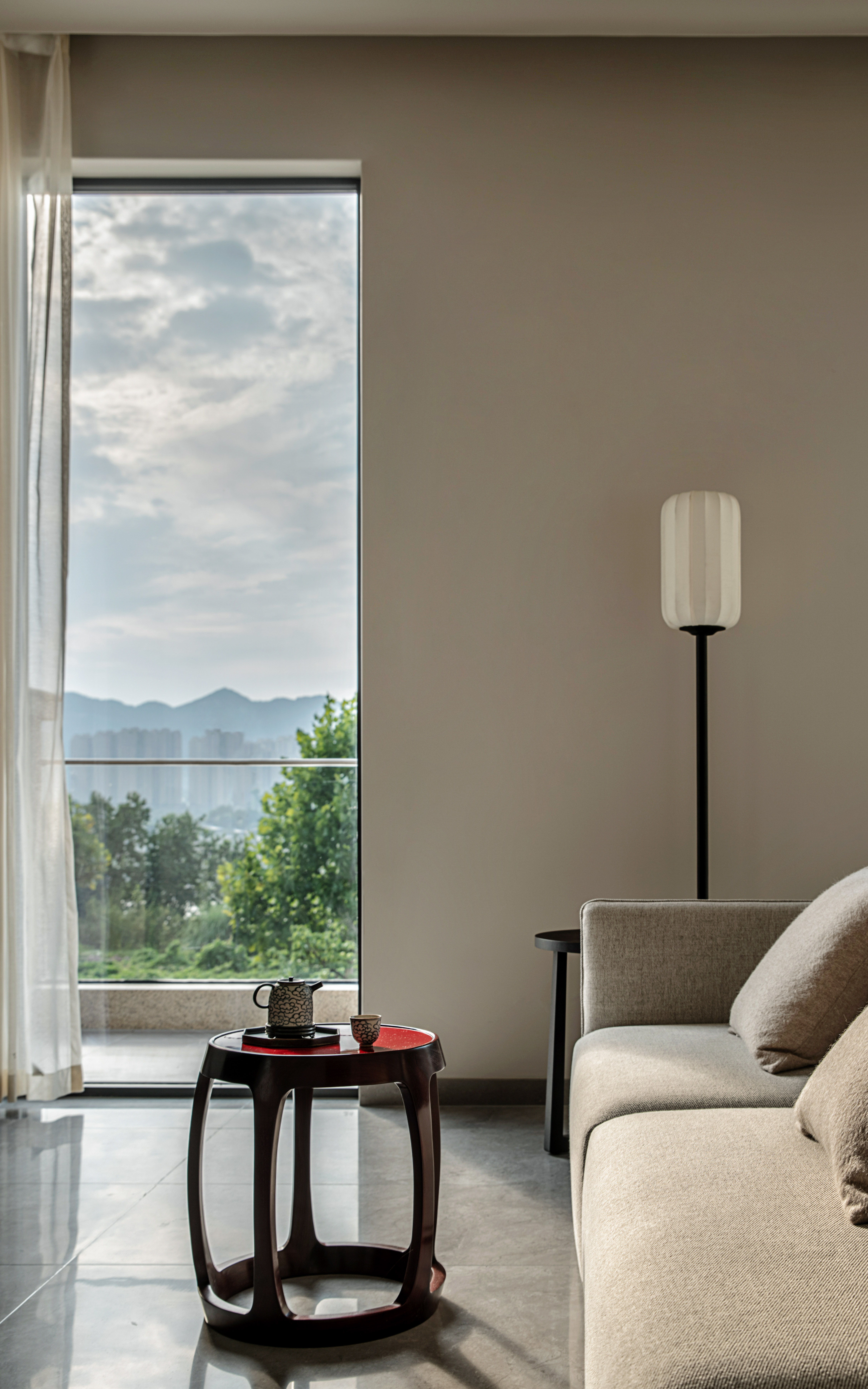 客厅、茶室中的阳角和柱子,皆采用了弧形设计,