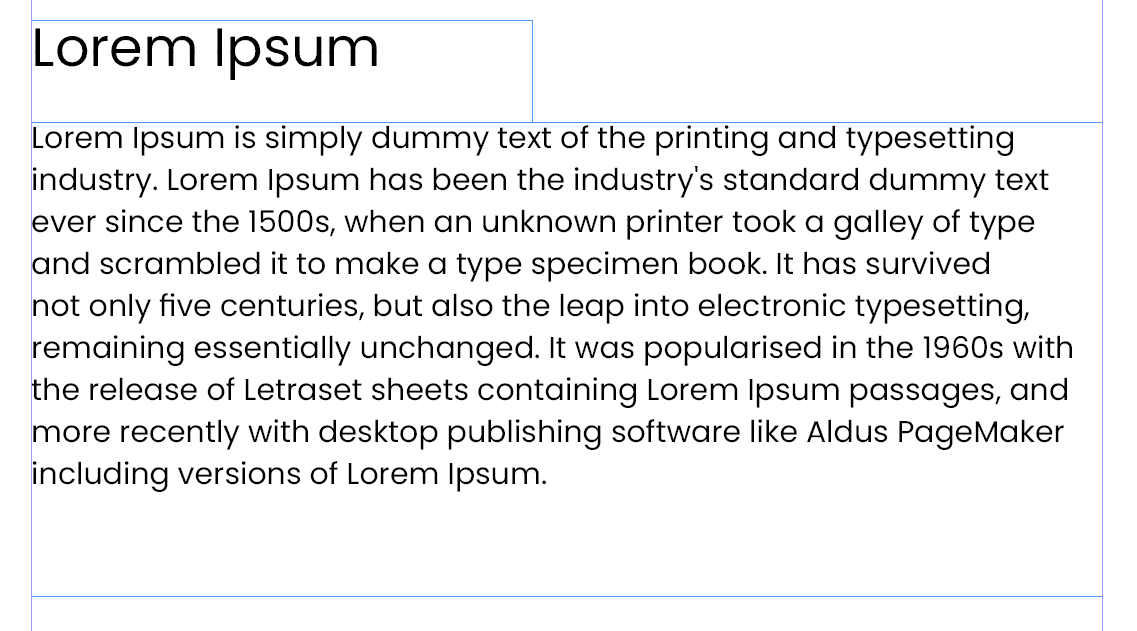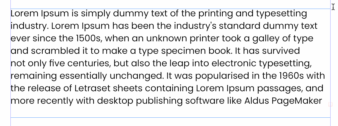 不同于Ps和Ai中具有点文本框和区域文本框两种形式的文本框,在Indesign中只有区域文本框一种,所以当你输入一些单词或短句后,如果你想要让文本框紧贴文字内容,你仅需要双击文本框左下角,文本框就可以自动贴合文字内容了。使用区域文本框时,你只需要双击文本框下边框中间的小方框,文本框就可以自动收缩到最后一行文字。这个操作可以让整个版面上看上去更加舒爽。