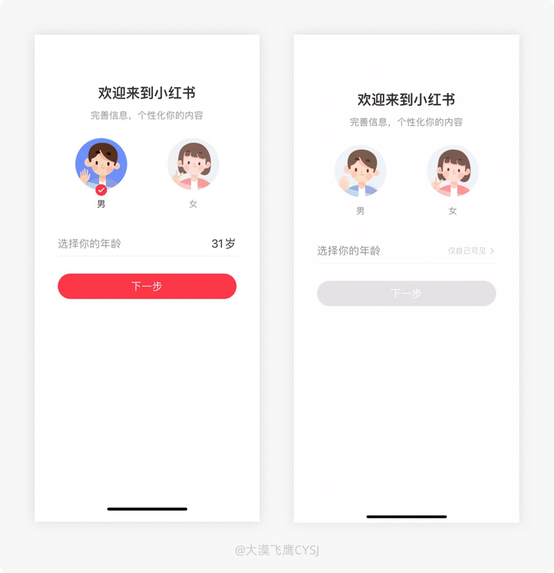 首次登录小红书,选择好性别后无需任何操作即可自动触发下一选项-年龄选择,以减少操作步骤的方式让用户更快完成信息的录入,“一石二鸟”的免去点击操作,节省用户时间成本。众所周知,很多用户经历过在面对表单时“知难而退”情况,小红书则通过预判用户接下来的必要操作并主动触发,会让整个流程变的更高效,以此提升产品的易用性及用户的完成率。