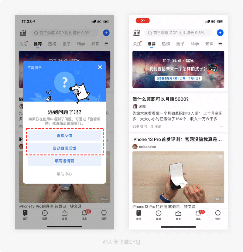进入知乎APP后摇一摇,系统会以弹窗的形式提供反馈入口,避免用户有真正反馈需求时因找不到入口而放弃。虽然摇一摇是隐藏性质的,用特定的交互手势方可触发且没有明确的提示,用户需要在无意中才能发现,但这却增加了一种送达用户的途径,提升反馈入口被用户发现的几率。另外,基于人性化考虑,若用户感觉摇一摇呼出弹窗会影响正常使用,点击左上角的“不再展示”关闭即可。