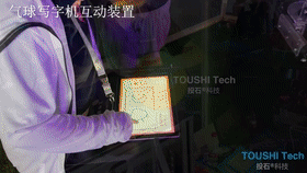 投石科技手绘气球互动装置主要由机械充气装置、触摸屏、氦气等组成,到场参与者通过在触摸屏上书写的方式来引出气球许愿的互动效果。