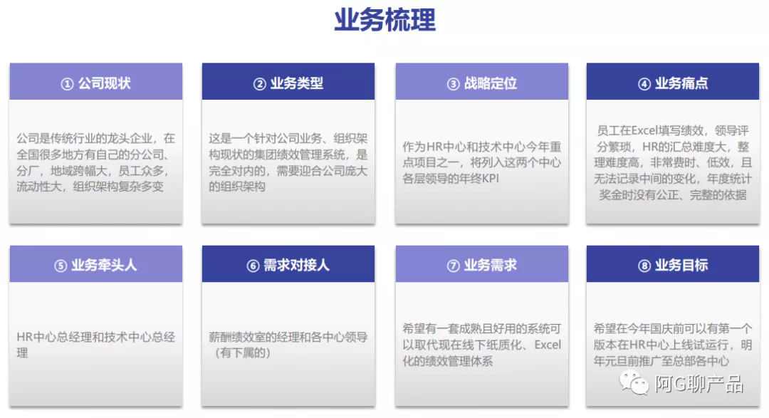 同时再找几个填写过或评分过多次绩效表格的老员工,做一轮用户访谈,基本就可以梳理出整体的业务逻辑和痛点。