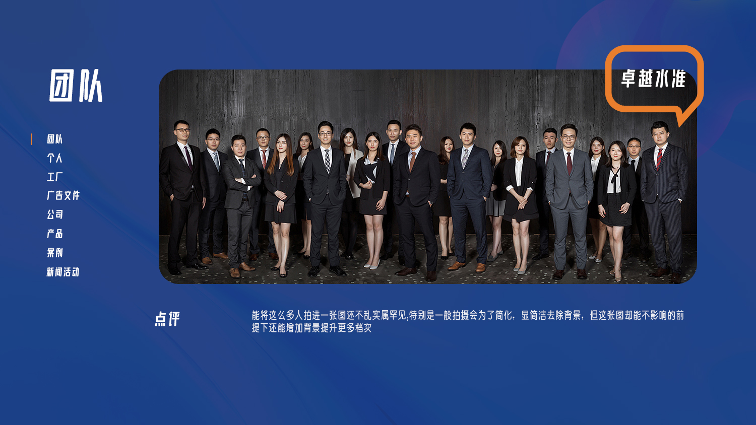 通常团队照都是无背景,这张更出色的理由就在于融入了背景并且人物群像更多。