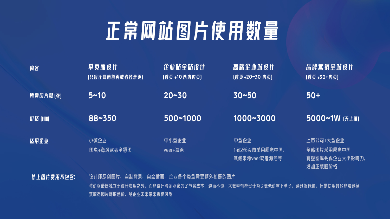 在这里,我是真的呼吁每一位企业家,去重视图片给自身企业的影响,根据自身的情况为图片付费。设计师也需要多主动去引导客户进行知识付费,不要因为一时的为客户节省节约费用,带来未来无尽的隐患。在这里,我也例举了要做好一个网页最初级最基本的图片价格