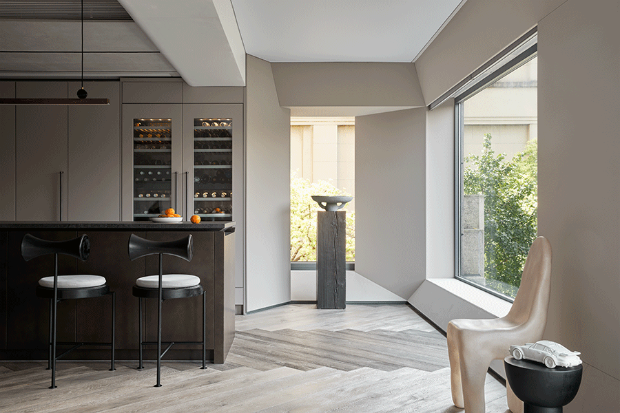 空间艺术是感情的表露,是一种人人都能理解的语言。带有极简主义意识的灯具、造型迥异的凳子、极简抽象的椅子打破常规的生活氛围,深化空间的情感。