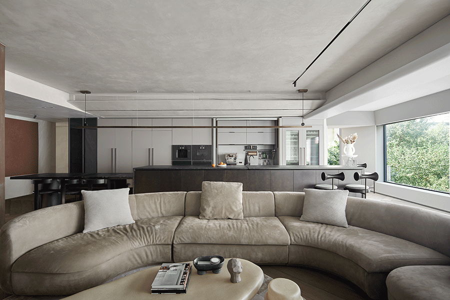 客厅空间是以流动性串联起实用功能的自然分割。情绪的表达则内涵于每一个空间对材质、对色彩,以及对艺术性的考究。然设计的手法却尽量以最简洁的语言隐藏锋芒,不争不抢如春雨润物无声,自然流淌出最舒适的情绪。