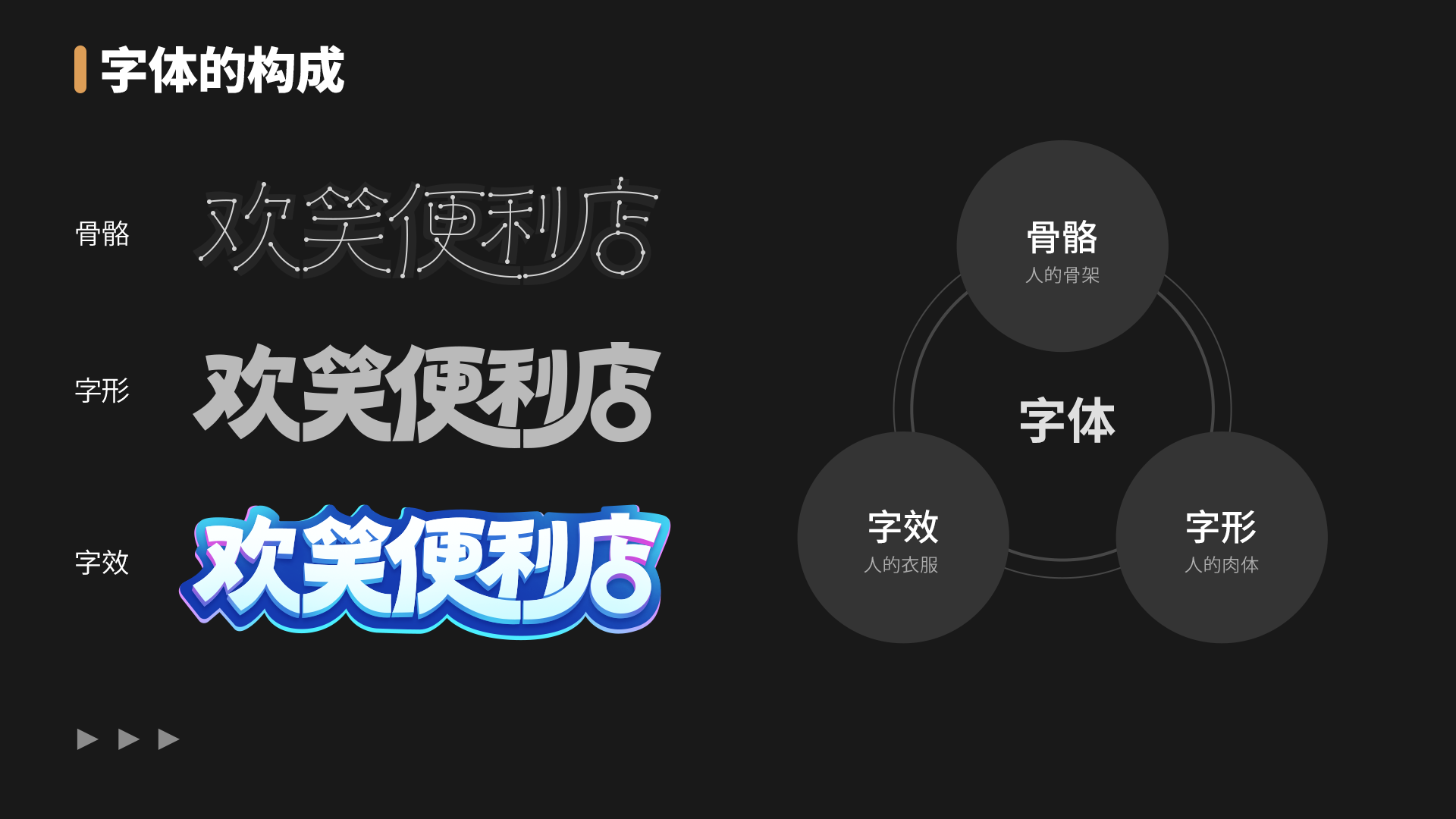 谈到字体设计,首先得从一个字体的构成说起,字体主要由骨骼、字形、字效(字体效果)相构成,如果把字体比作是一个人,那么字体骨骼就好比于人的骨架、字形好比于人的肉体、字效好比于人的衣服,三者相互依赖相互影响缺一不可