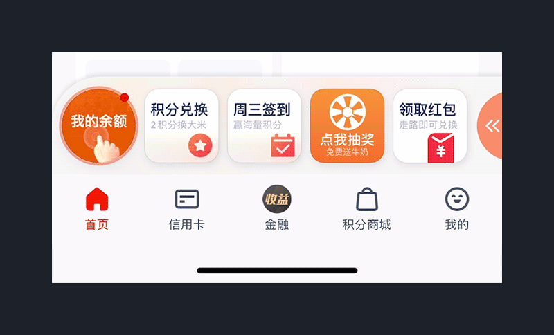 将一些重点功能通过悬浮层的形式设计在底部,随着交互的变化进行隐藏和显示,也是一种非常不错的设计解决方案。比如平安口袋银行将我的余额、积分兑换、签到、抽奖、领取红包等设计在底部标签栏之上,通过悬浮层的形式呈现,让这些原本隐藏的功能得到了曝光,增加了用户的关注度。