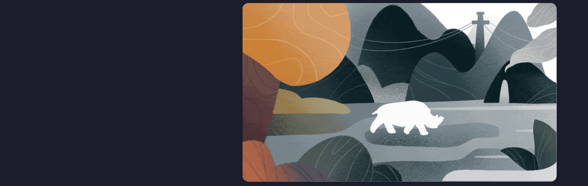 旅鸽、白鱀豚 、白犀牛都采用白色剪影的形式,象征着这些都是已逝去的灵魂。我们现在只能通过影像再次看到它们。每个动物的场景画面从彩色的到黑灰色再到最后的白色(仔细看画面,例如犀牛,可以看到之前的树藤变成了线缆),隐喻着这些动物们的经历,最后直至消失。