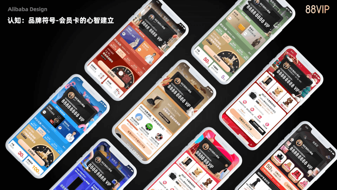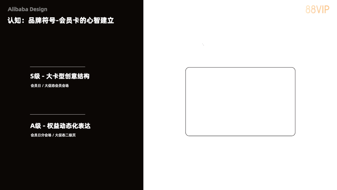 而在会员营销场景下,以建立用户心智为目标,88VIP通过对品牌符号的打造和复刻提升用户感知度,将会员卡的卡框结构放在版头的位置,承载了用户的信息,让每一个进到会场的用户都能清楚的认知到自己的身份。