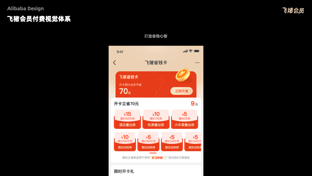 在飞猪会员的付费体系中,通过红色的选择、金币的动效、省钱计算器的拟物化设计来模拟客观世界的方式强化用户对“省钱”心智的感知。打通省钱卡在酒店、交通行业中的搭售能力以及在飞猪域外投放组件的设计,完成了飞猪会员付费体系0到1的建设。