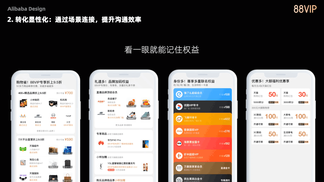 在淘系整体人群运营循序渐进的发展背景下,88VIP一直在探索如何能让用户对权益有更强的感知,并将权益感知归为4个梯度:权益原子表达\权益显性化表达\权益智能化表达\权益内容化表达。