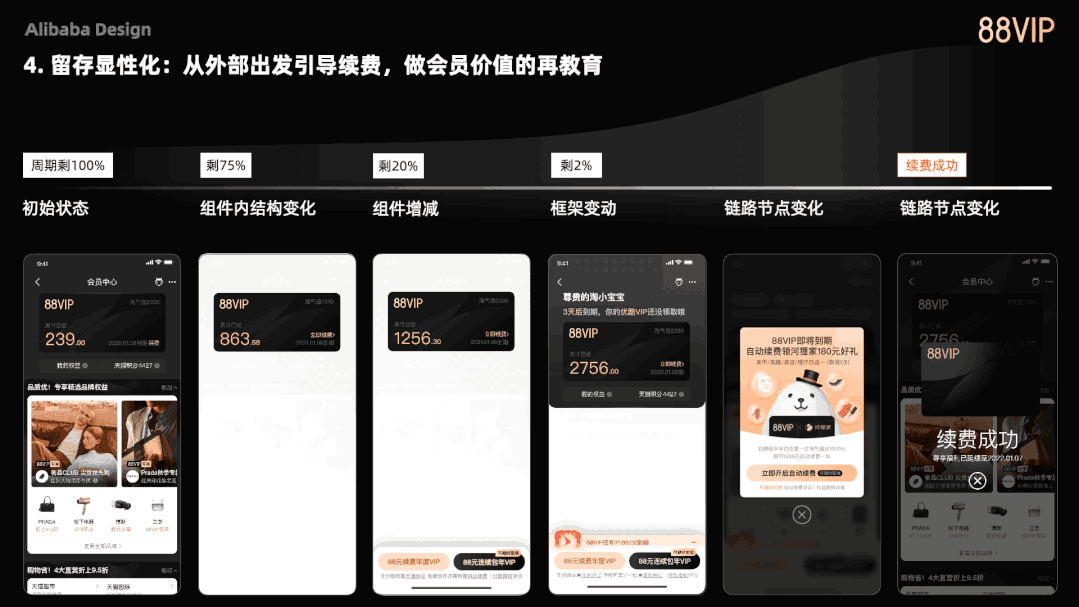最早只是在链路上到处透88VIP95折,但这样用户并不能理解95折到底带来什么结果;所以优化成更加直接地计算省钱金额给用户:折上95折预计可省XX元;如果结合智能化,还可以结合用户的行为,比如买了3次洗面奶的省钱数体感将比1次要更强;又或者更进一步,告诉用户“96%的88VIP觉得Prada享全年95折非常棒”,塑造出权益使用的氛围和情境感。