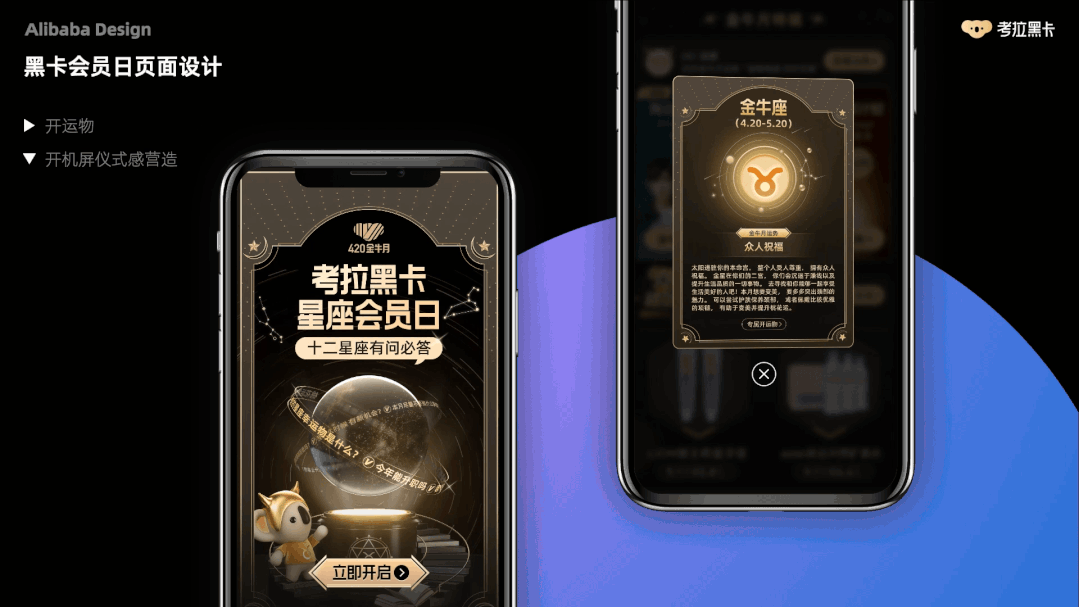 设计层则以“星空”、“卡牌”的形式表达,营造氛围。几者相结合形成启动效应,通过每一期的反复出现从而慢慢形成心智。420星座会员日后,考拉会员日正式从“大促场”向“心智场”转变。