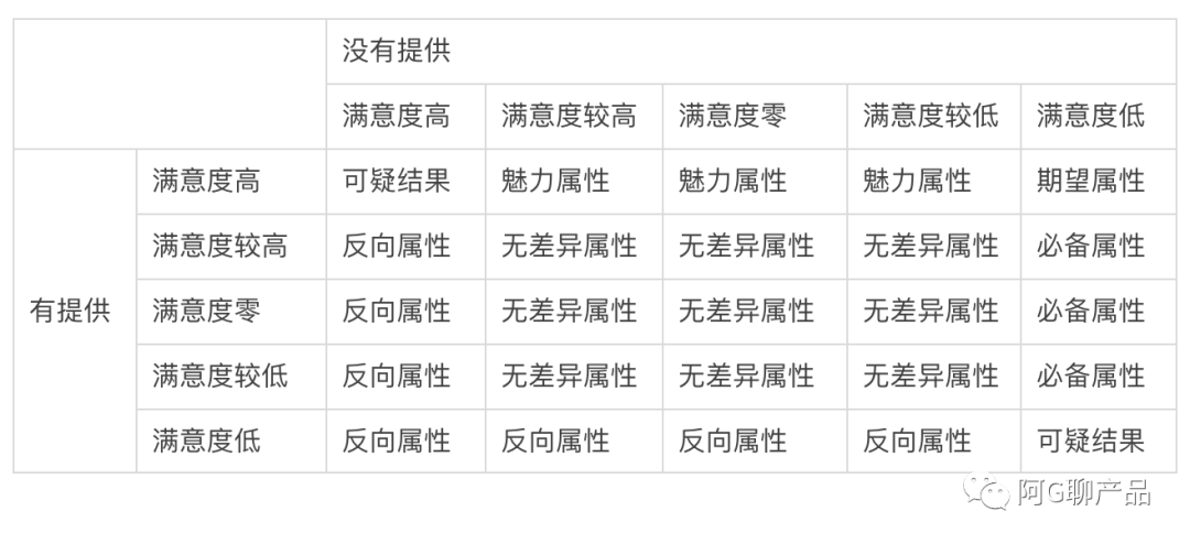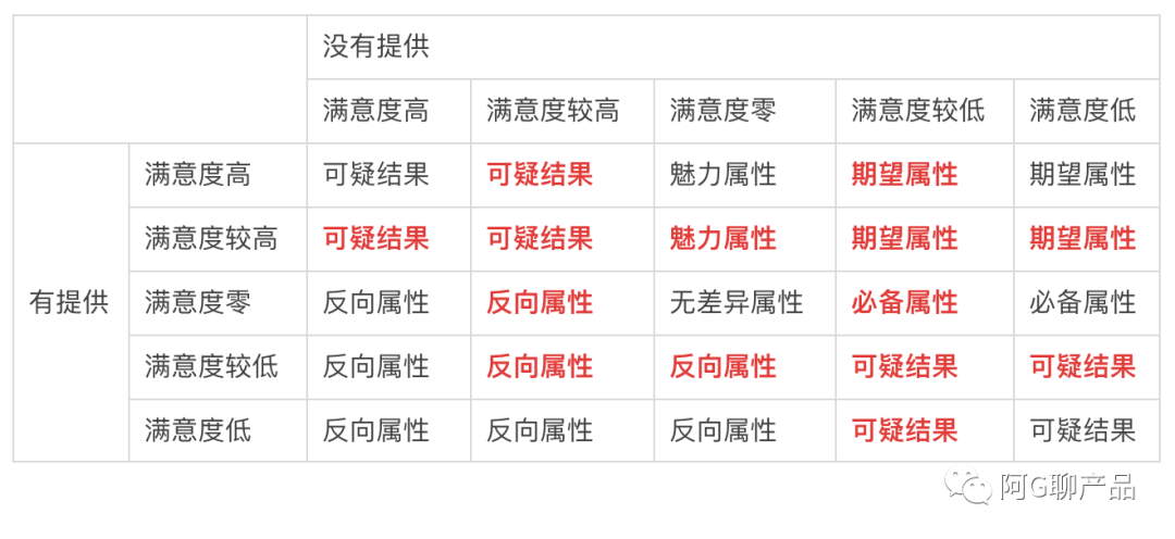 注意,按照概念,反向属性应该是提供程度和用户满意度成反比,也就是说产品提供了用户就不满意,所以上表只有左下角是明确的「反向属性」,有几个反向属性可以考虑转为「可疑结果」。