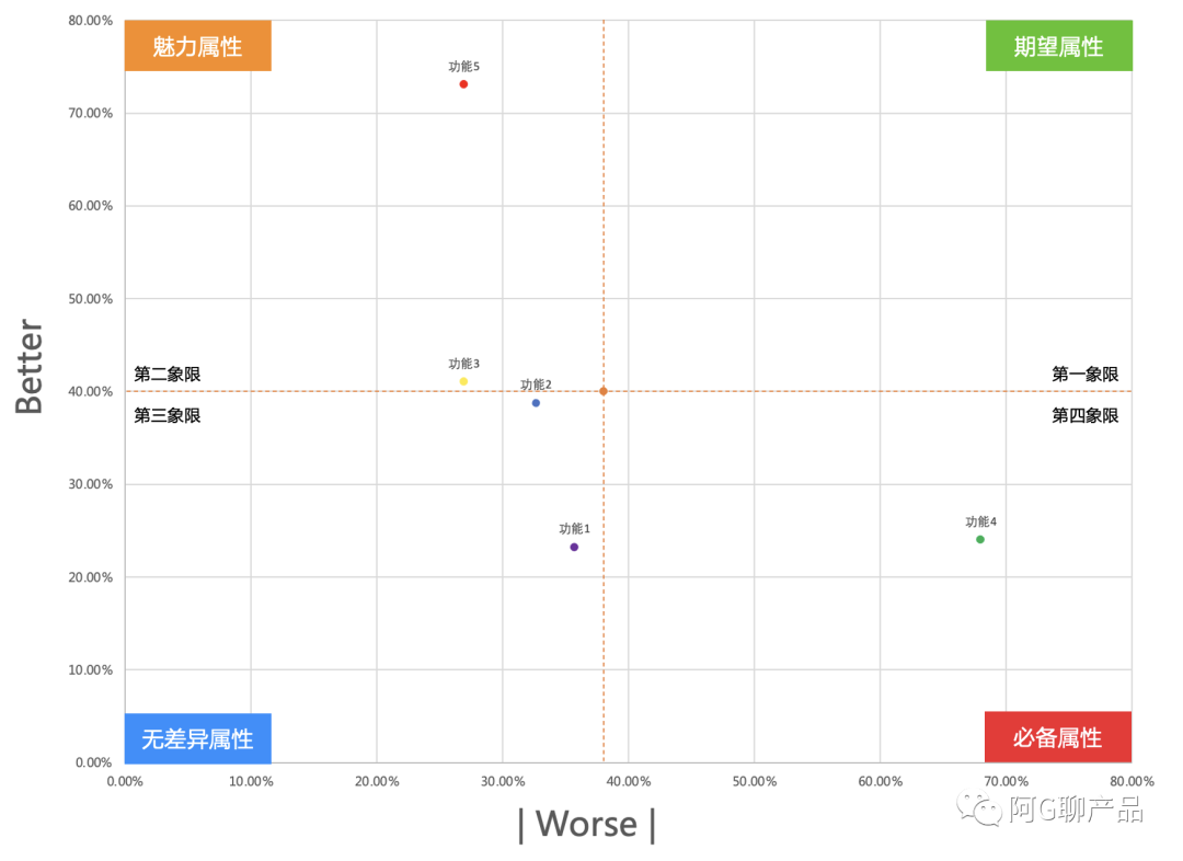 第四象限Better低,Worse绝对值高,表示不提供此类型功能时,用户满意度会大幅下降,因此落在这个象限的需求都是必备属性。
