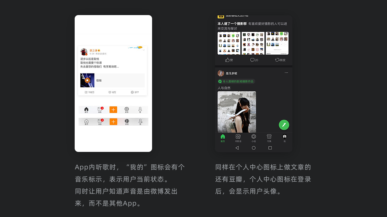 「微博」App内听歌时,“我的”图标会有个音乐标示,表示用户当前状态。