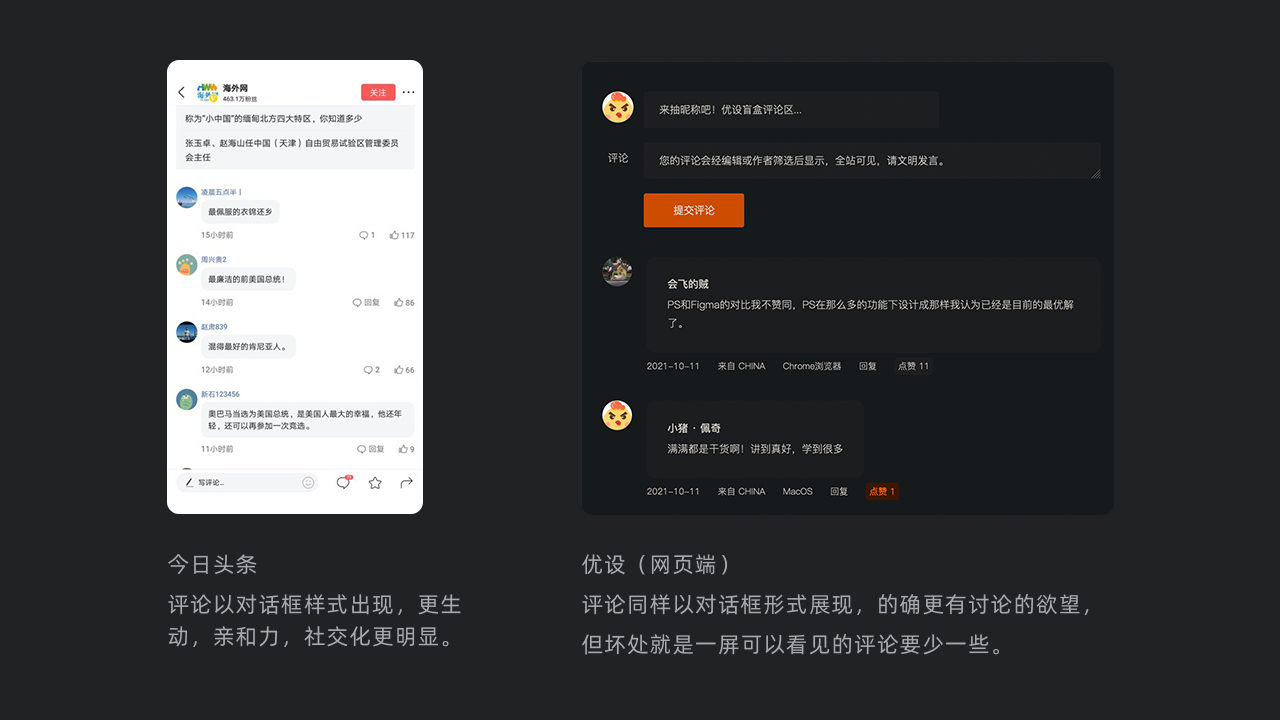 「今日头条」评论以对话框样式出现,更具生动,亲和力,社交化更明显。