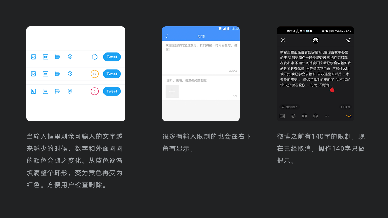 「Twitter」当输入框里剩余可输入的文字越来越少的时候,数字和外面圈圈的颜色会随之变化,从蓝色逐渐填满整个环形变为黄色再变为红色,方便用户检查删除。