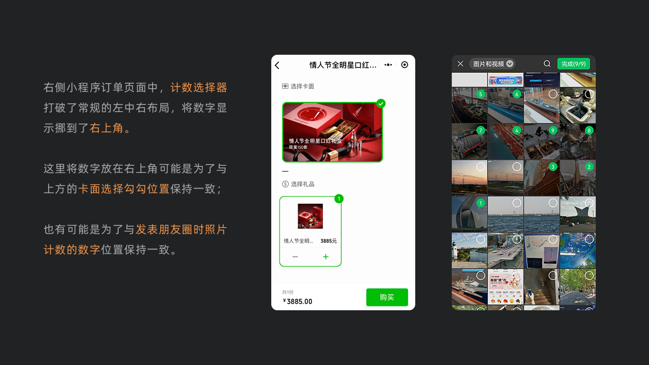 也有可能是为了与发表朋友圈时照片计数的数字位置保持一致。