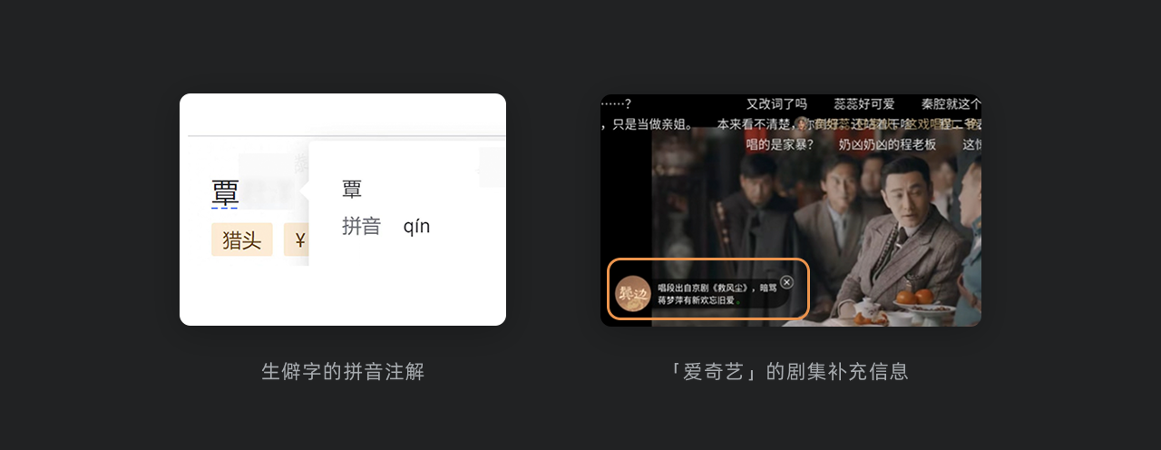 当我们看一部时代背景不熟悉,场景设定,概念名词有比较专业小众时,作为观众我们往往会因为不理解而对故事产生疑惑,「爱奇艺」的做法可以让用户及时了解到注解,如若真对该词条感兴趣,还能马上点击条目调出更详细的百科解释。缩短用户的操作路径,让体验更加周到。