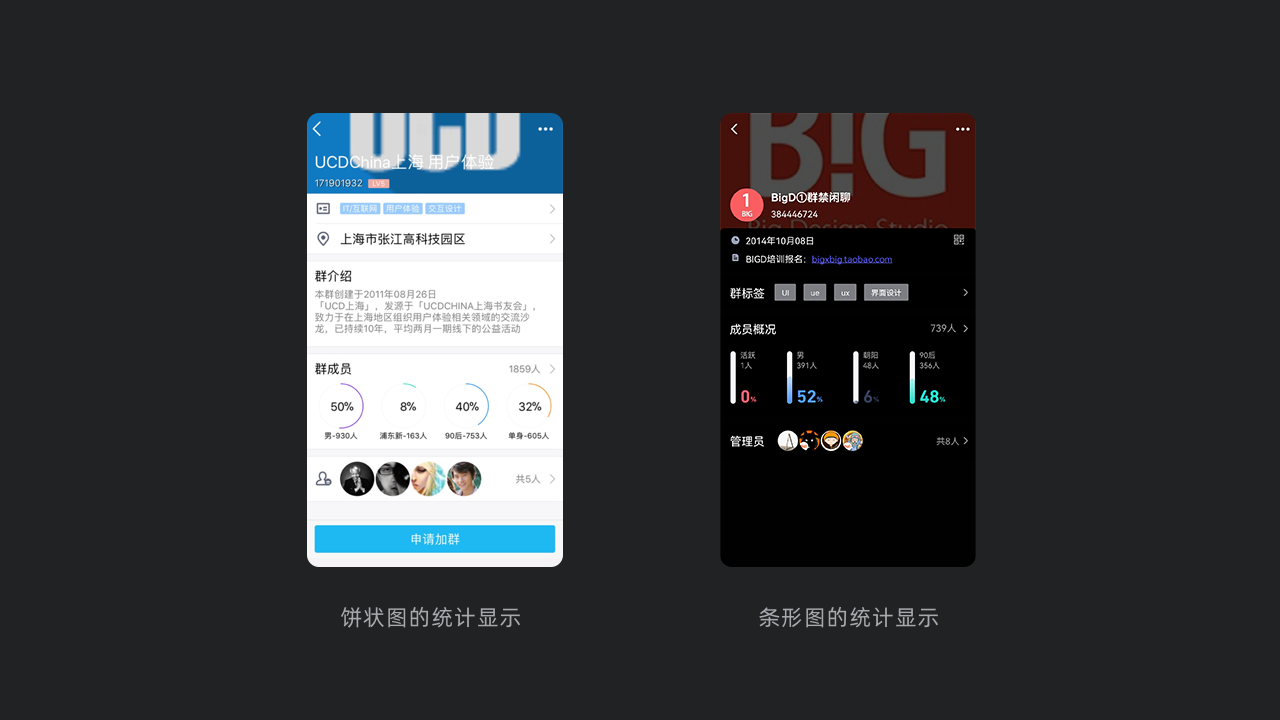 QQ群的介绍页面会显示性别,地域,年龄,单身等方面的比例数据,让加群的人可以更快的对这个群有所了解。