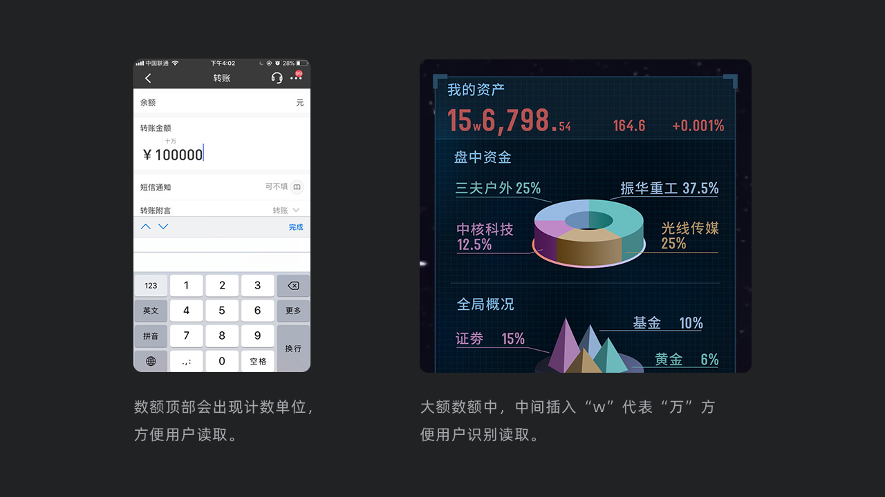 右侧例子是我4年前的一个数据可视化项目,大额数额中,中间插入“w”代表“万”方便用户识别读取。