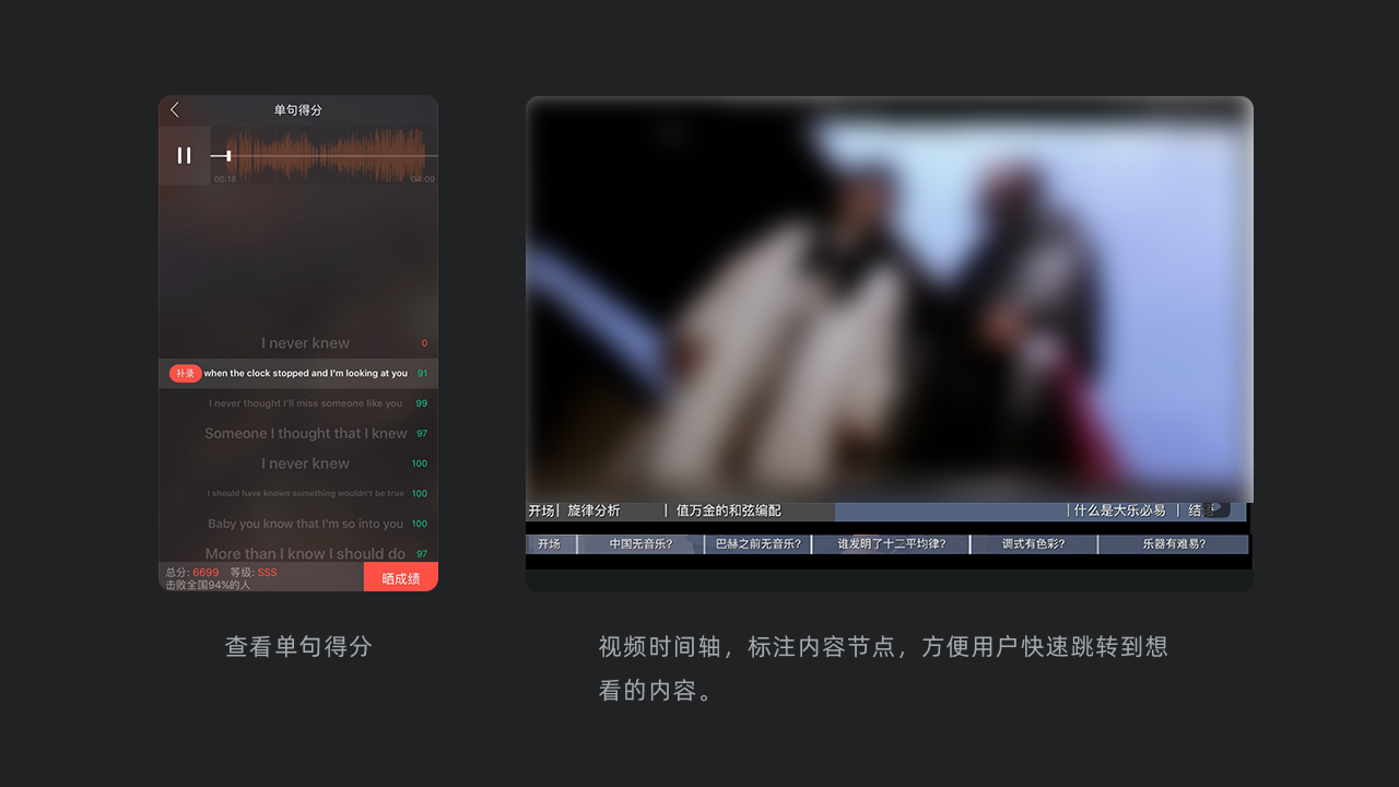 「唱吧」录音完成后,可查看单句得分,成绩详情一目了然,还可以单句补录,唱错了不用整首重来。