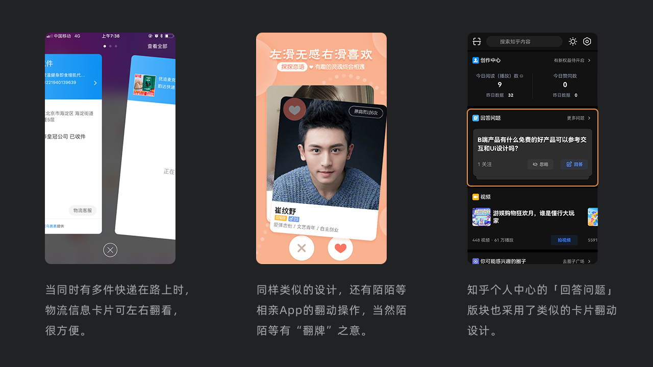 知乎个人中心的「回答问题」版块也采用了类似的卡片翻动设计。