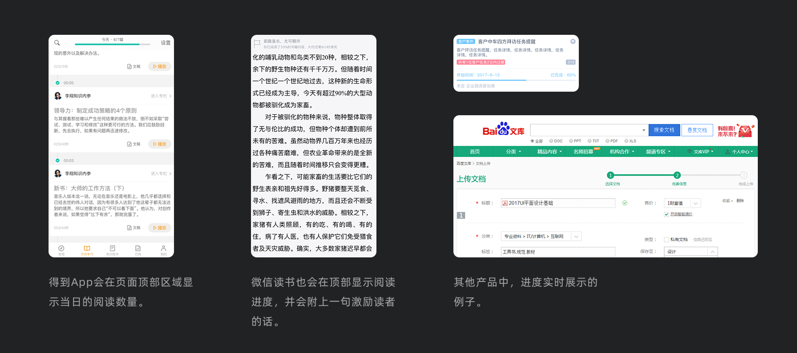 触类旁通:当用户通过持续操作,付出获得结果时,最好实时的告知“任务”完成的进度,还可以添加一些激励的话,给用户更多耐心与勇气。