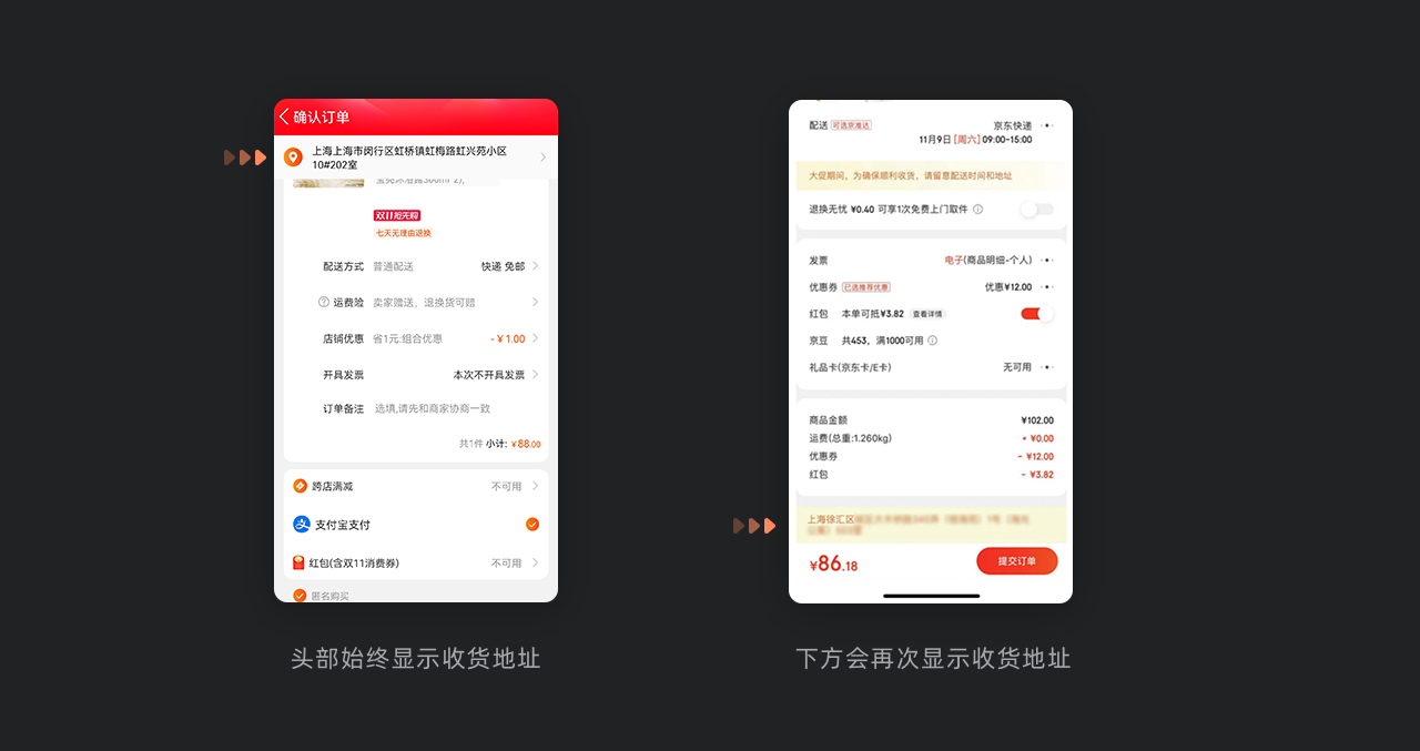 「京东」的做法则是在页面底部,提交订单按钮上方再次出现,并且提醒强度更强。