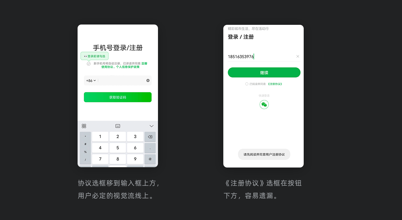 以往很多产品都是将同意协议选框放在页面底部自动勾选,而现在法律要求用户登录注册时,必须手动同意协议。但是问题在于,用户在输入完信息后很容易跳过忽视这个协议选框。