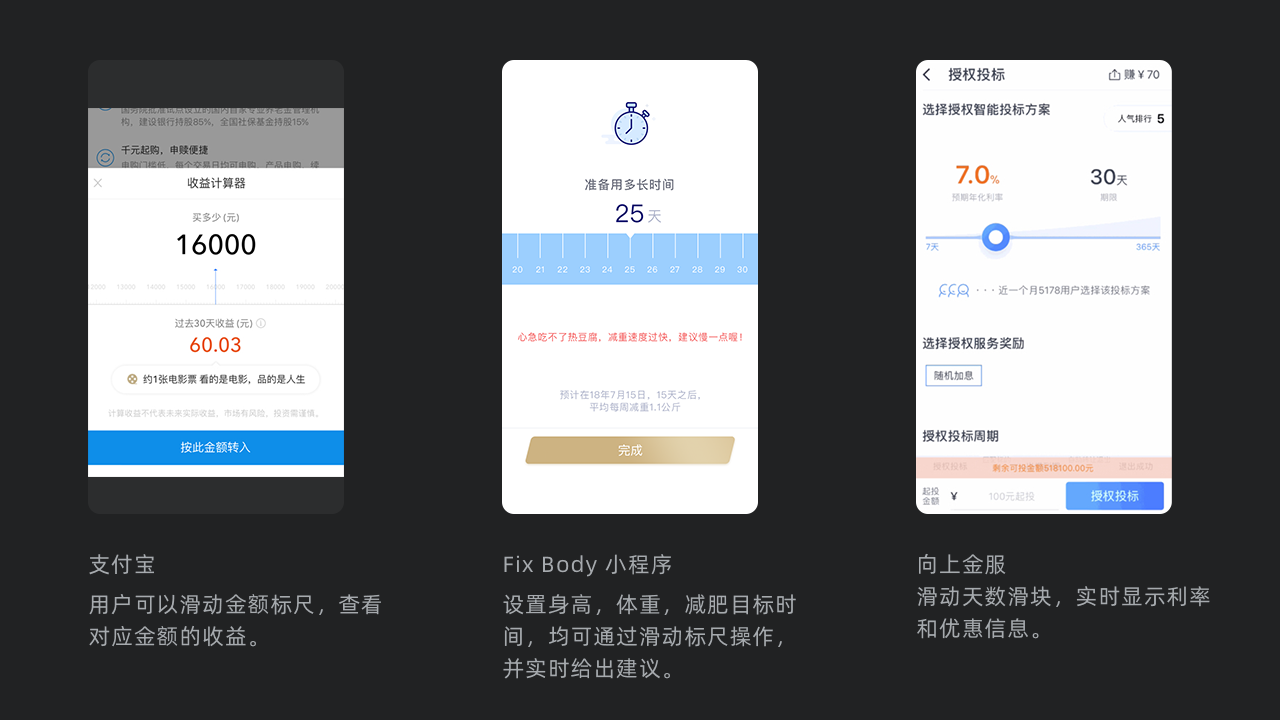 「支付宝」理财产品预约界面,用户可以滑动金额标尺,查看对应金额的收益,避免输入不同的金额的频繁操作,更直观表现购买金额与收益的关系。