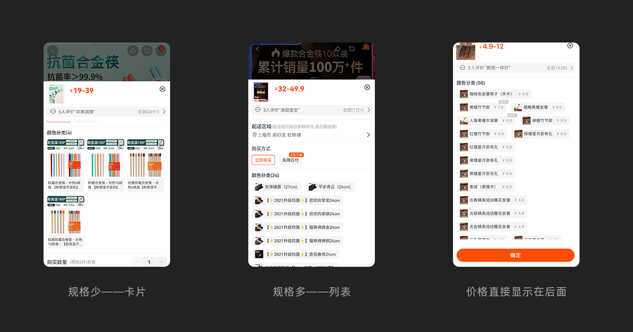 淘宝的商品款式规格选择底部弹窗,款式规格少的以卡片方式显示,款式图片更大,如果款式繁多,就按条目样式显示,一屏内可以看见更多款式。