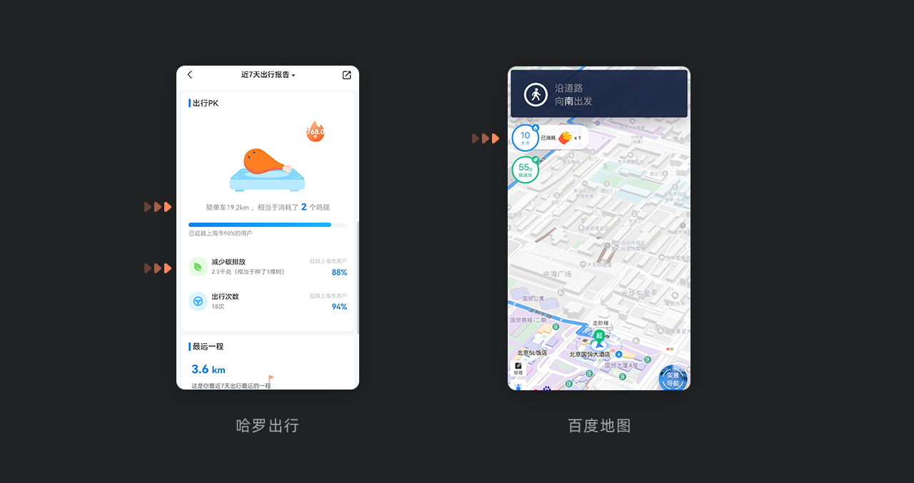 步行时使用「百度地图」App进行道路导航,系统会自动计算行走路程碳减排与消耗卡路里的数值,在通过食物的图标(比如薯条🍟、巧克力🍫等)表现出来。