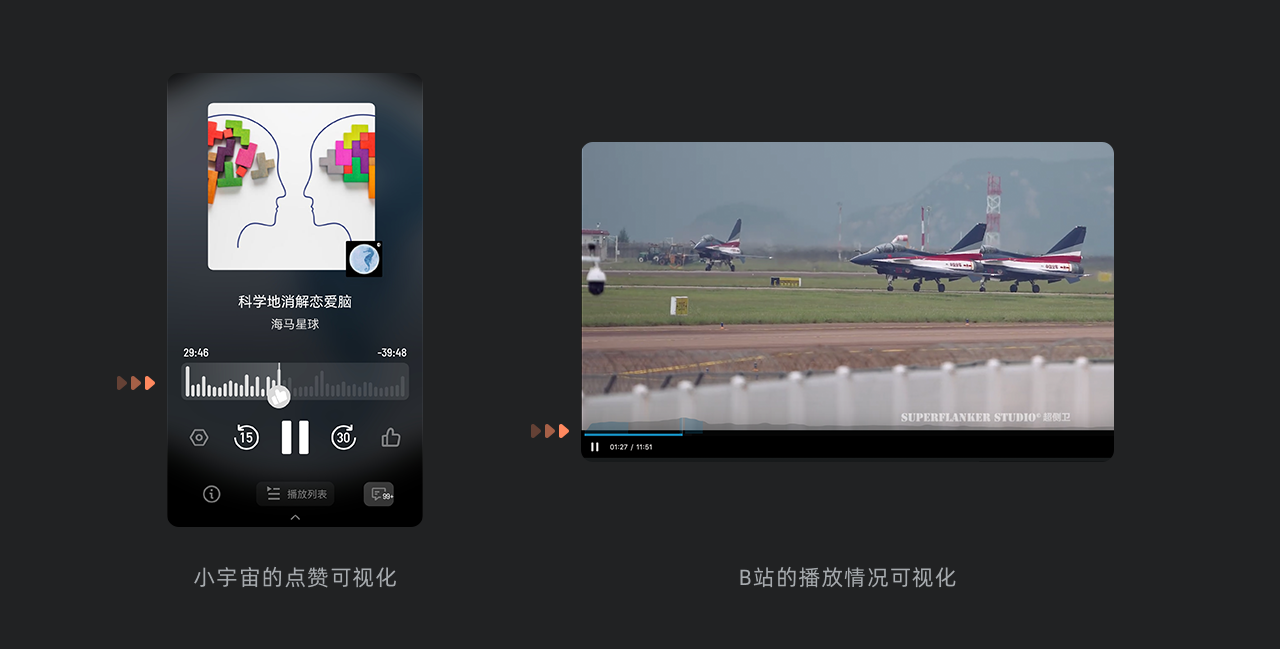 「小宇宙」在播放进度条上,将用户的点赞情况进行了可视化的传达。柱子较高的地方代表了该片段有较高的点赞数量,帮助其他听众直观了解单集中的「高赞」位置,提高了内容获取的效率与质量。