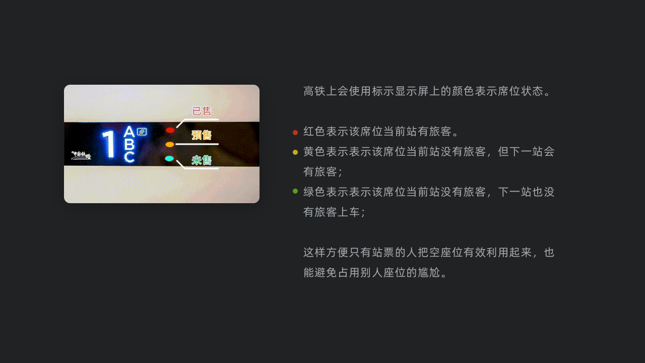 高铁上会使用标示显示屏上的颜色表示席位状态。