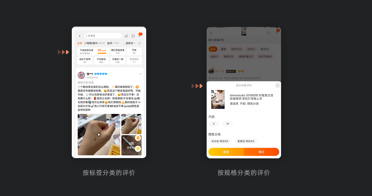 「淘宝」上这些产品的评论区,头部会有多个关键词标签对这些评论分类,比如最显眼的标签——特定肤质,特定颜色标签等,都可以方便用户快速判断产品是否适合自己。