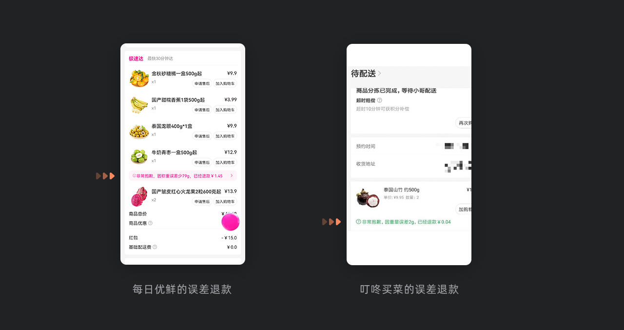 「每日优鲜」中,订单下达一段时间后,会告知实际称重与标记的差值:“非常抱歉,因为重量误差…已经退款¥1.45元”,