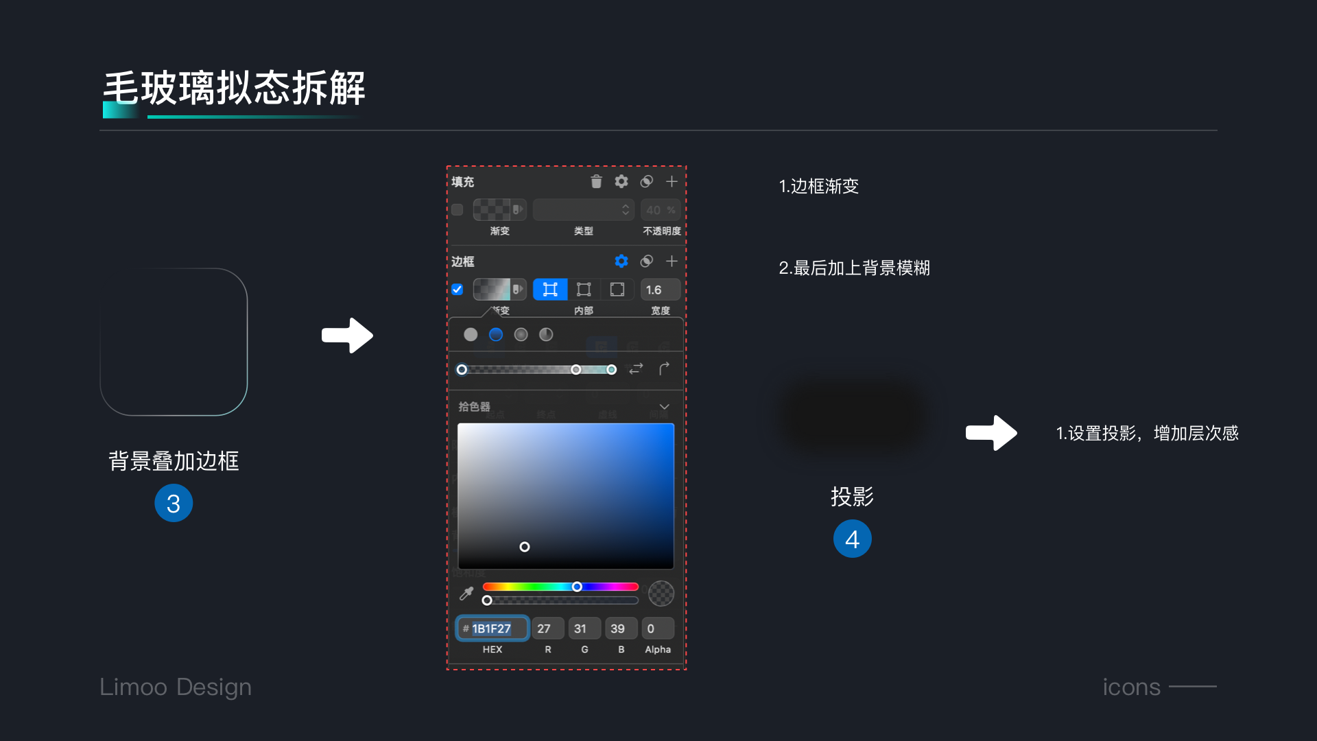 填充设置好了之后,再调整边框的样式,然后给出背景模糊,这样的话背景底就有了玻璃效果啦。