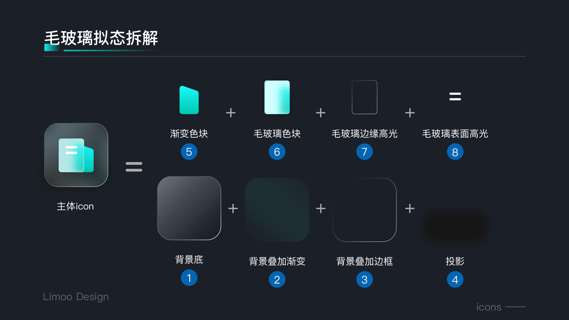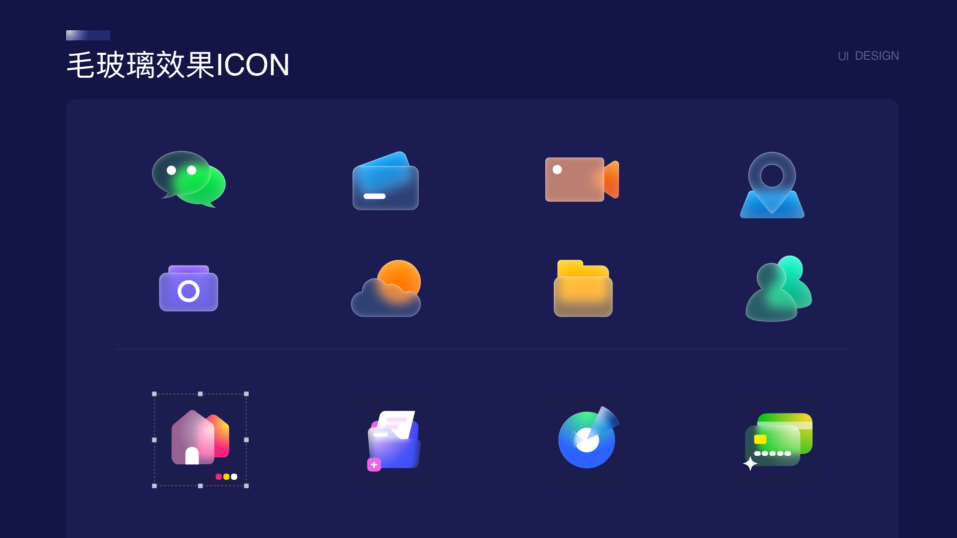 这是画的几个样式的图标,先看一下。毛玻璃新拟态风格主要分为两个层面,一个是填充色块、一个是玻璃质感的样式叠加。