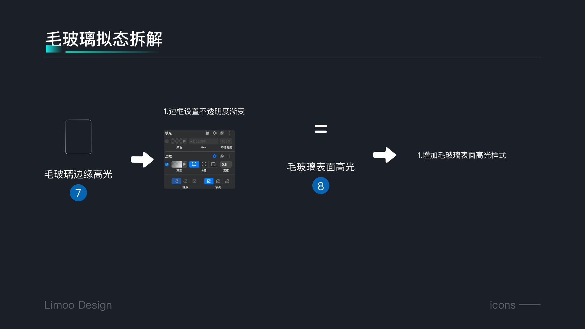 毛玻璃边缘高光,采用边框描边的效果,让边缘更加优质感,有光效的感觉。再添加上表面辅助图形高光,丰富整个图标样式。