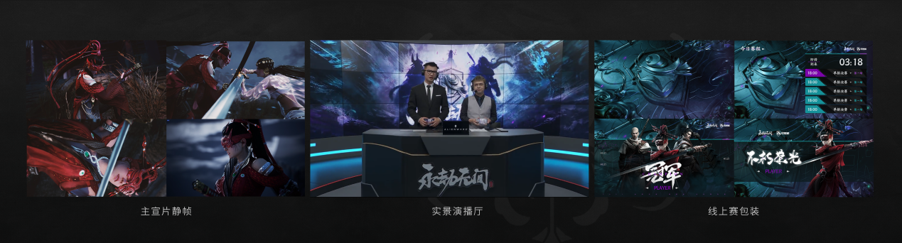 网易CFUN设计中心:《永劫无间》作为一款全新的多人动作竞技游戏,为了打造其东方色彩武学、自由动作竞技的特点,以及在赛事直播流程中观众能有良好的、身临其境的观赛体验,我们通过视觉、动画及AR、XR等技术手段对整体的赛事品牌进行了全面的设定规划。