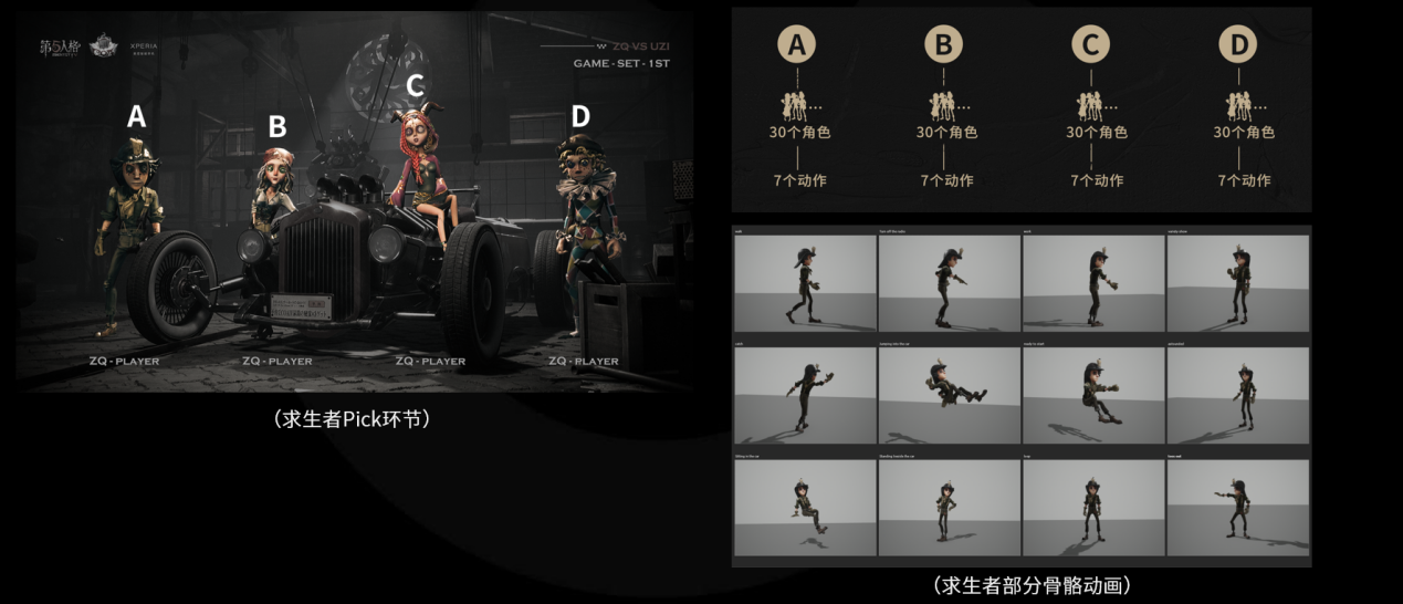 就角色动画匹配环节,求生者的角色共30个,场景会随机生成4组不同的出场区域,每个出场区域会检索相对应的动作,引擎必须实时检索840个动作,以此确保实时选择过程中ID角色选取的动作都是准确的。