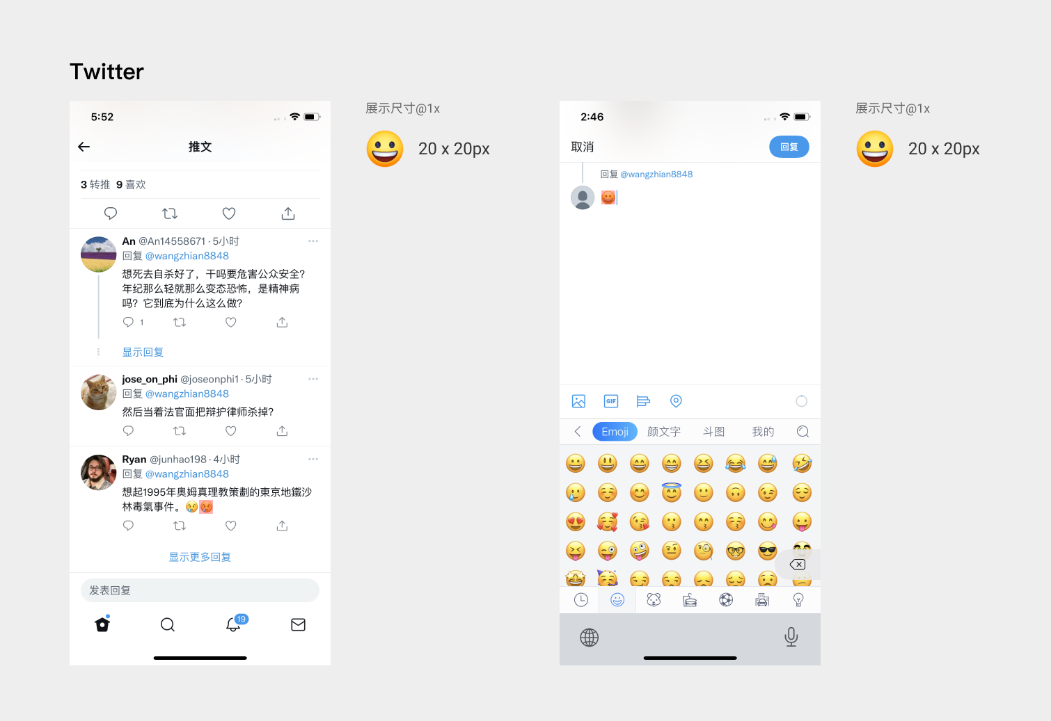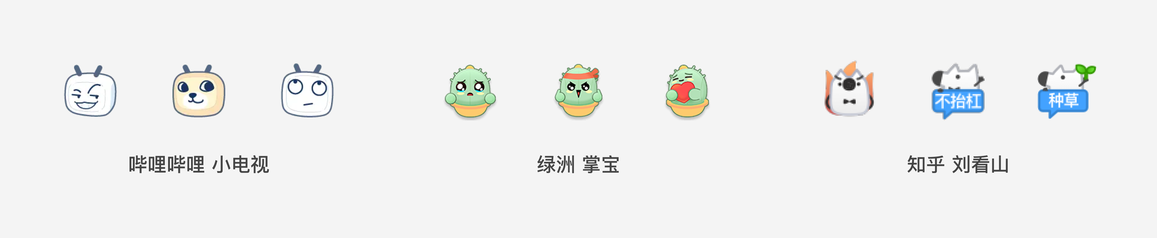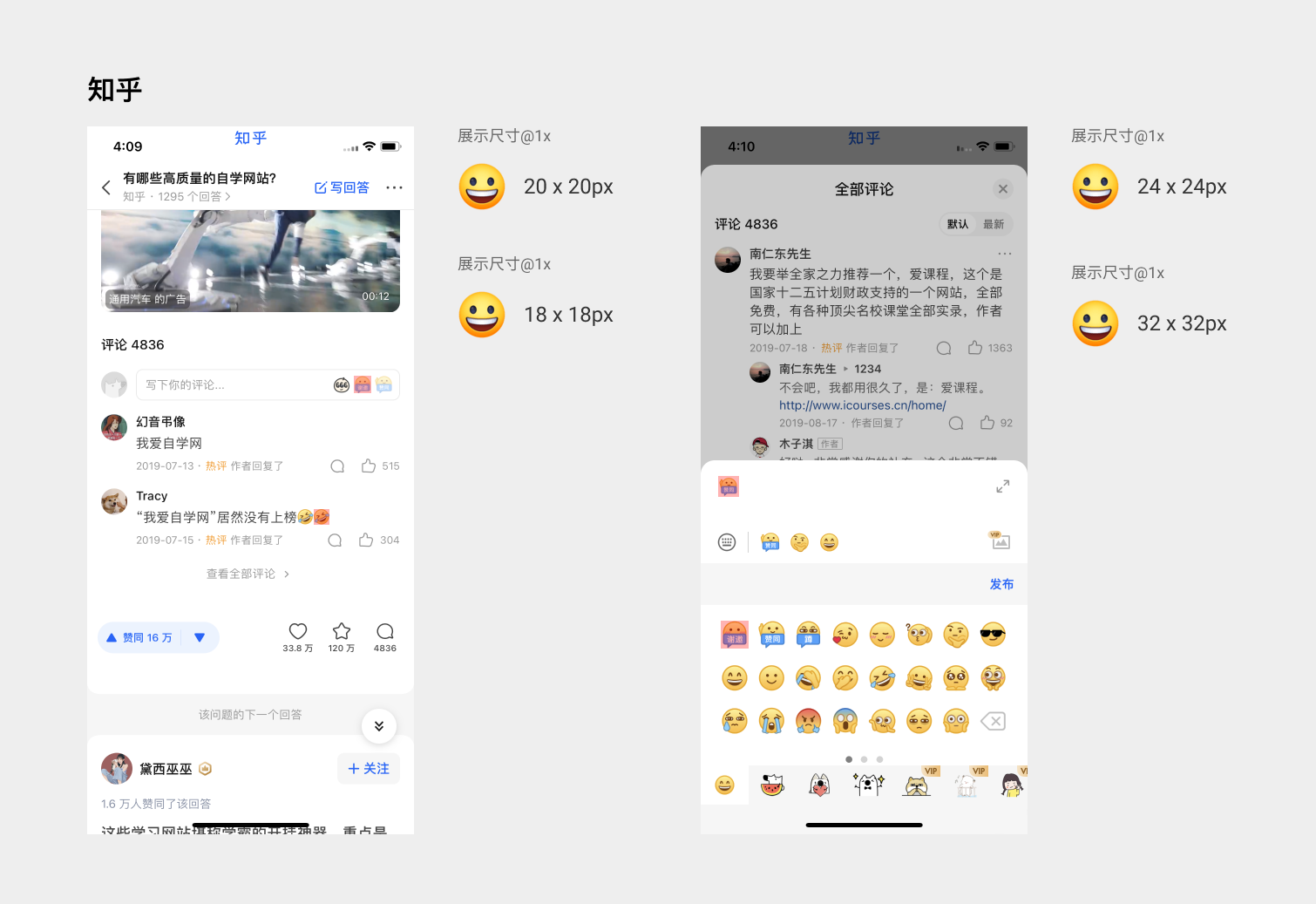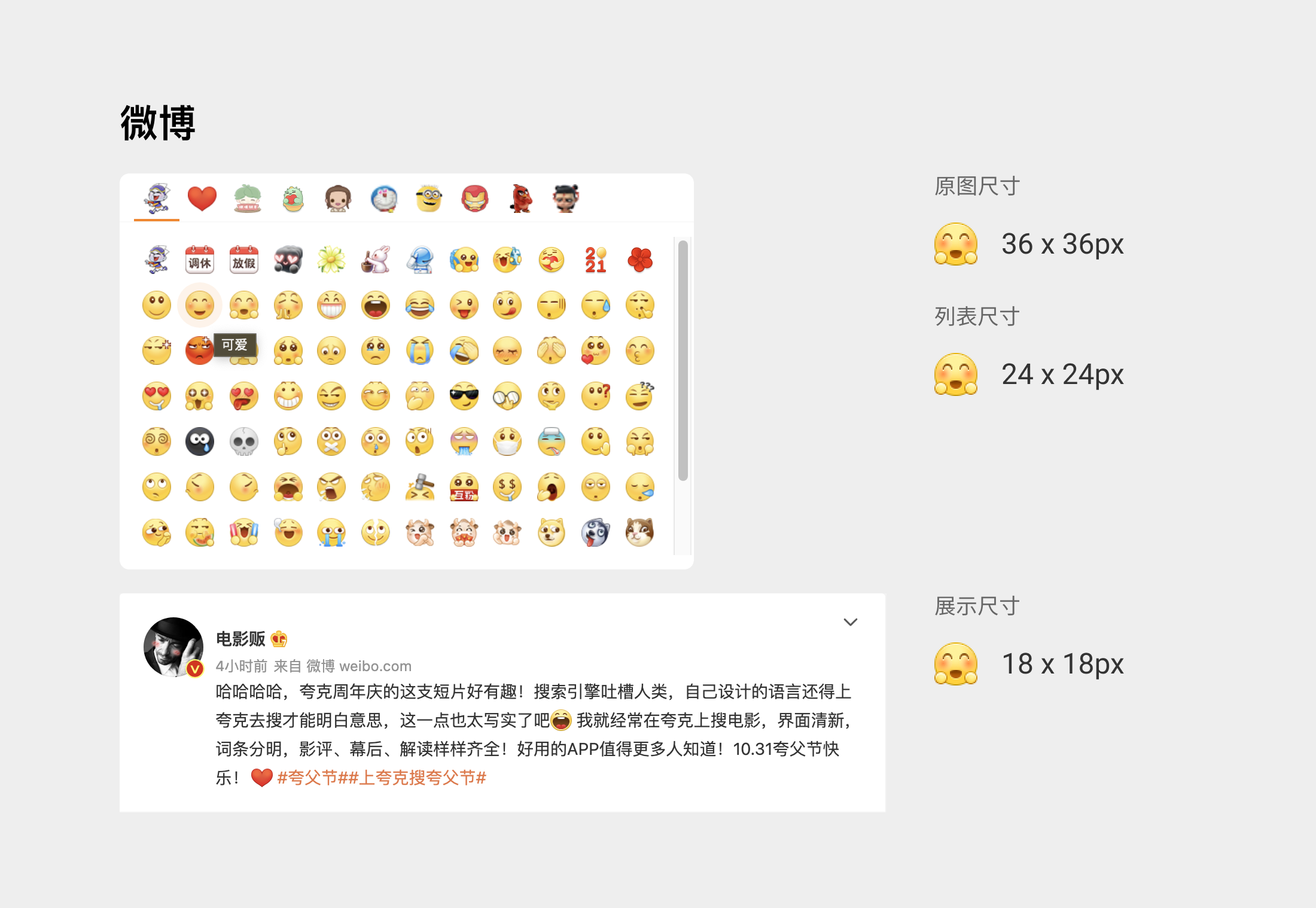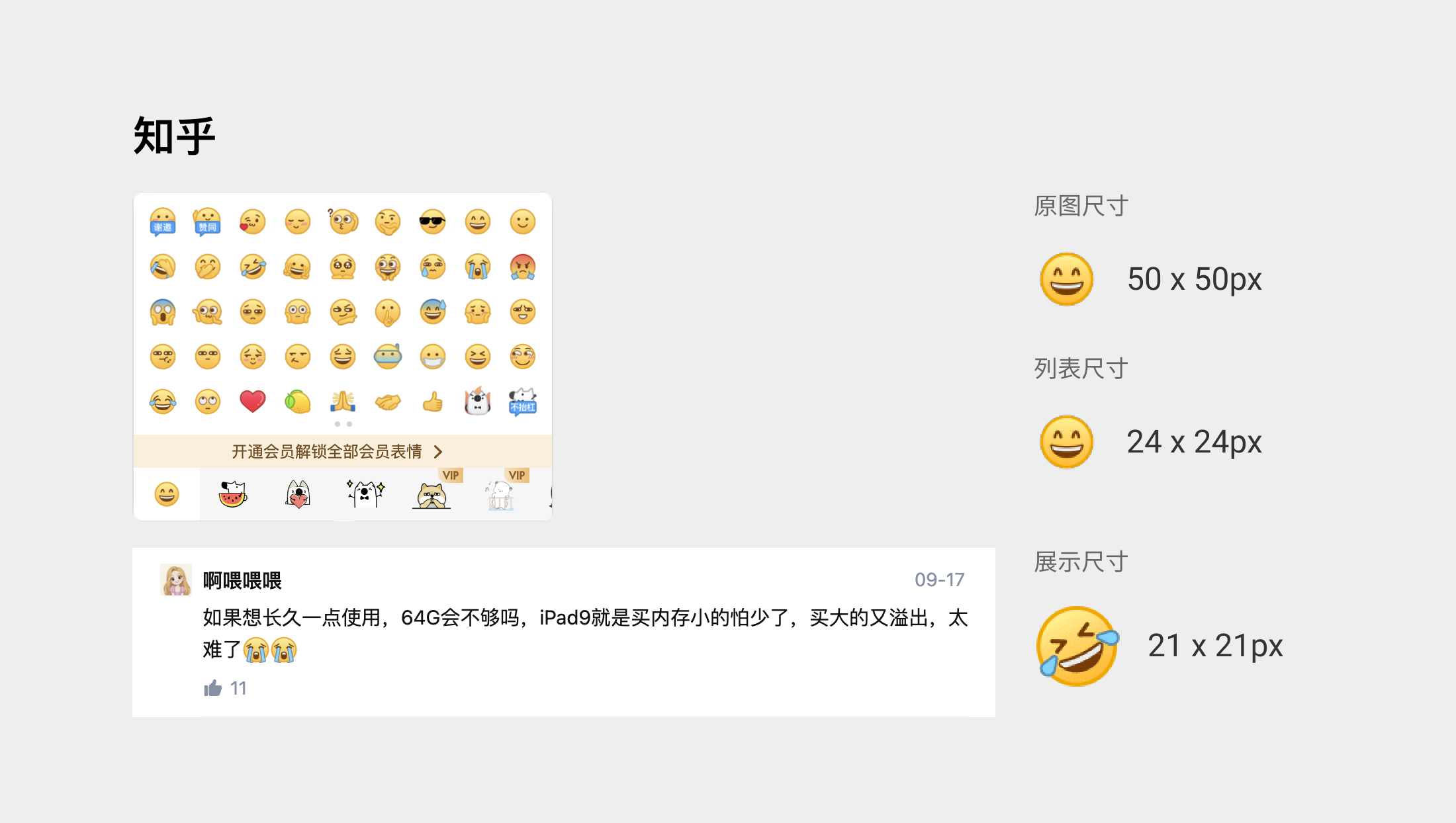 在不同的产品中我们也能够看到具有不同的IP形象或设计风格的表情符号。由于缺乏完善的表情符号设计规范,这里从 Web 和 App 端对其他产品表情符号的使用场景及尺寸规范进行探索。